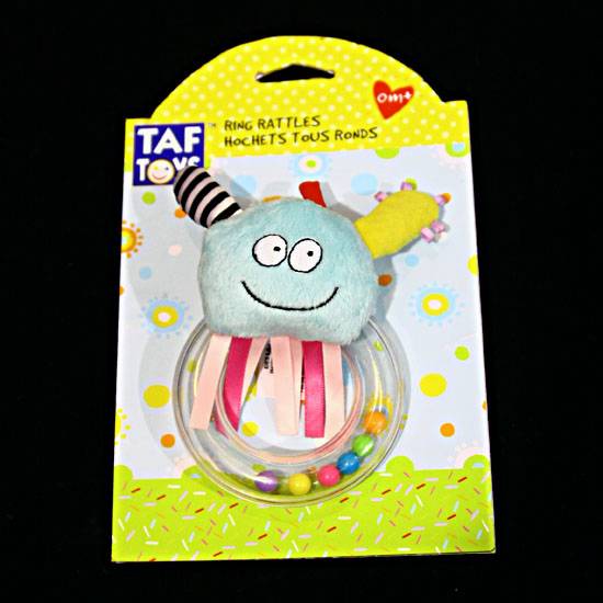The cute and adorable rattle ring has a clear plastic tube with multi-colored balls inside that make a rattling sound. The rattle is attached with a funny creature with horns. This rattle ring makes a great toy for babies to develop senses and motor skills.