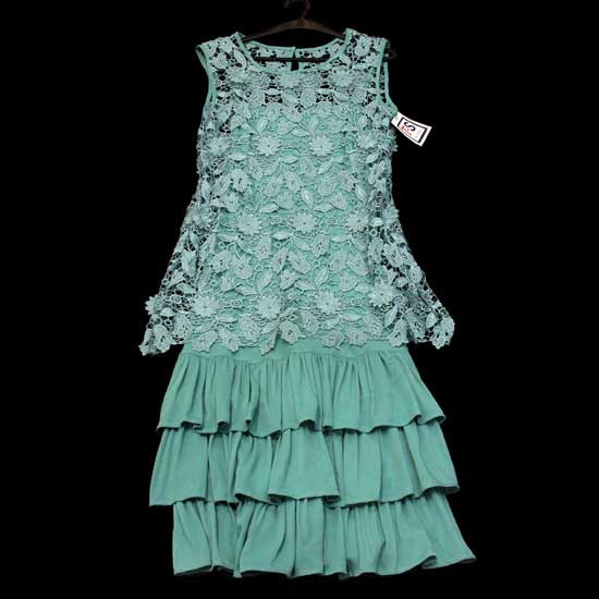 This sleeveless dress in green features a translucent lace top with leaf and floral patterns. The cozy skirt flaunts a layered design with frills. This elegant dress is ideal for summer days.