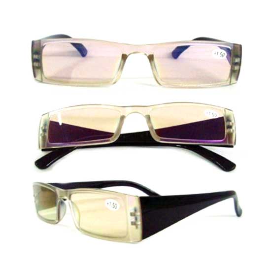 Displayed is a pair of reading glasses that comes in a modern design. Featuring rectangular rims, this pair of glasses has thick tapered temples for a fashionable look. This pair of reading glasses is made of high quality materials for durability.