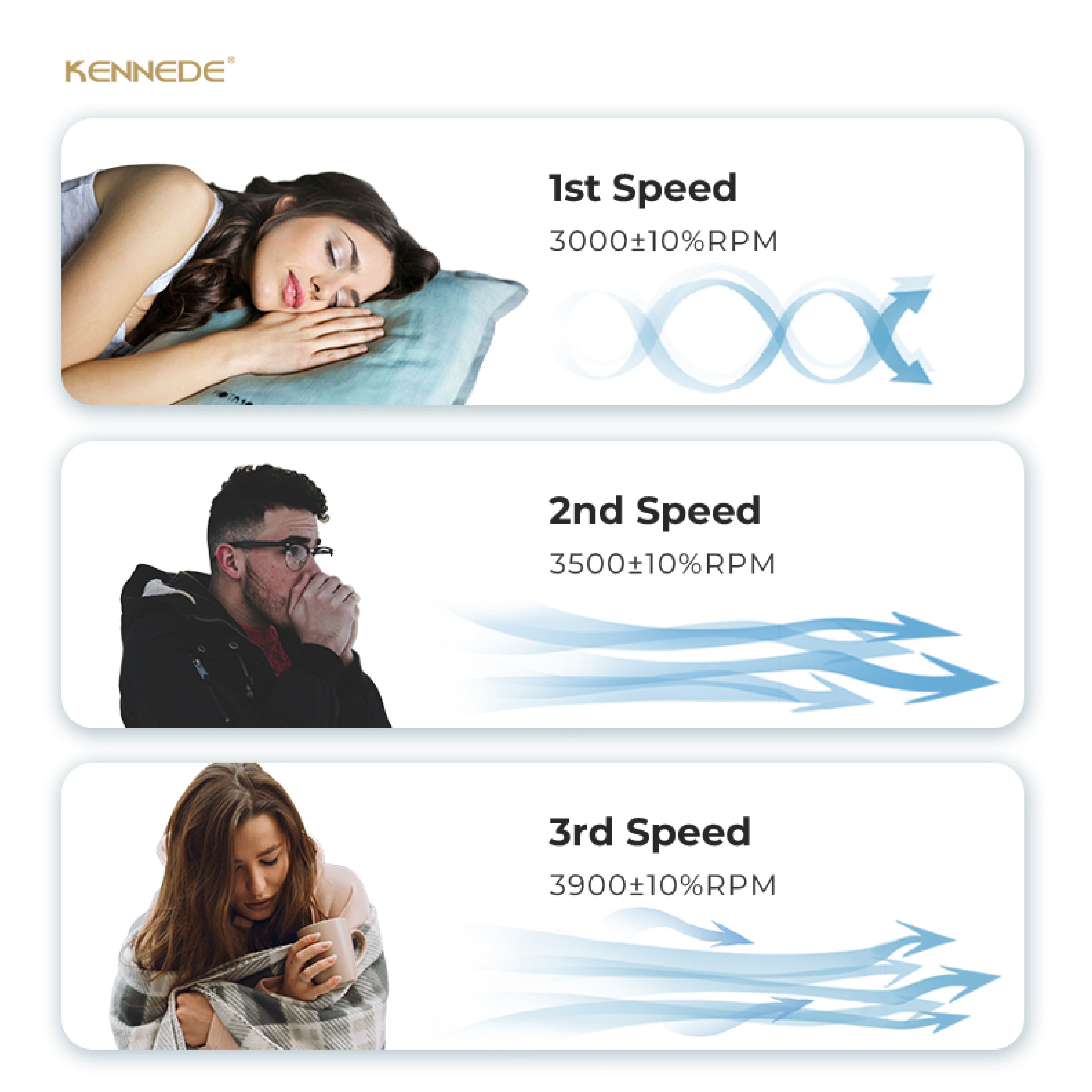 - Touch control switch with fan speed settings: Low / Medium / High / Off.