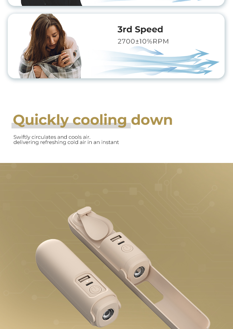 This mini fan combines portability, safety, and multifunctionality, making it a perfect companion for travel, outdoor activities, or daily cooling needs.