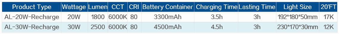 • Light type: AL-20W-Rechargeable
