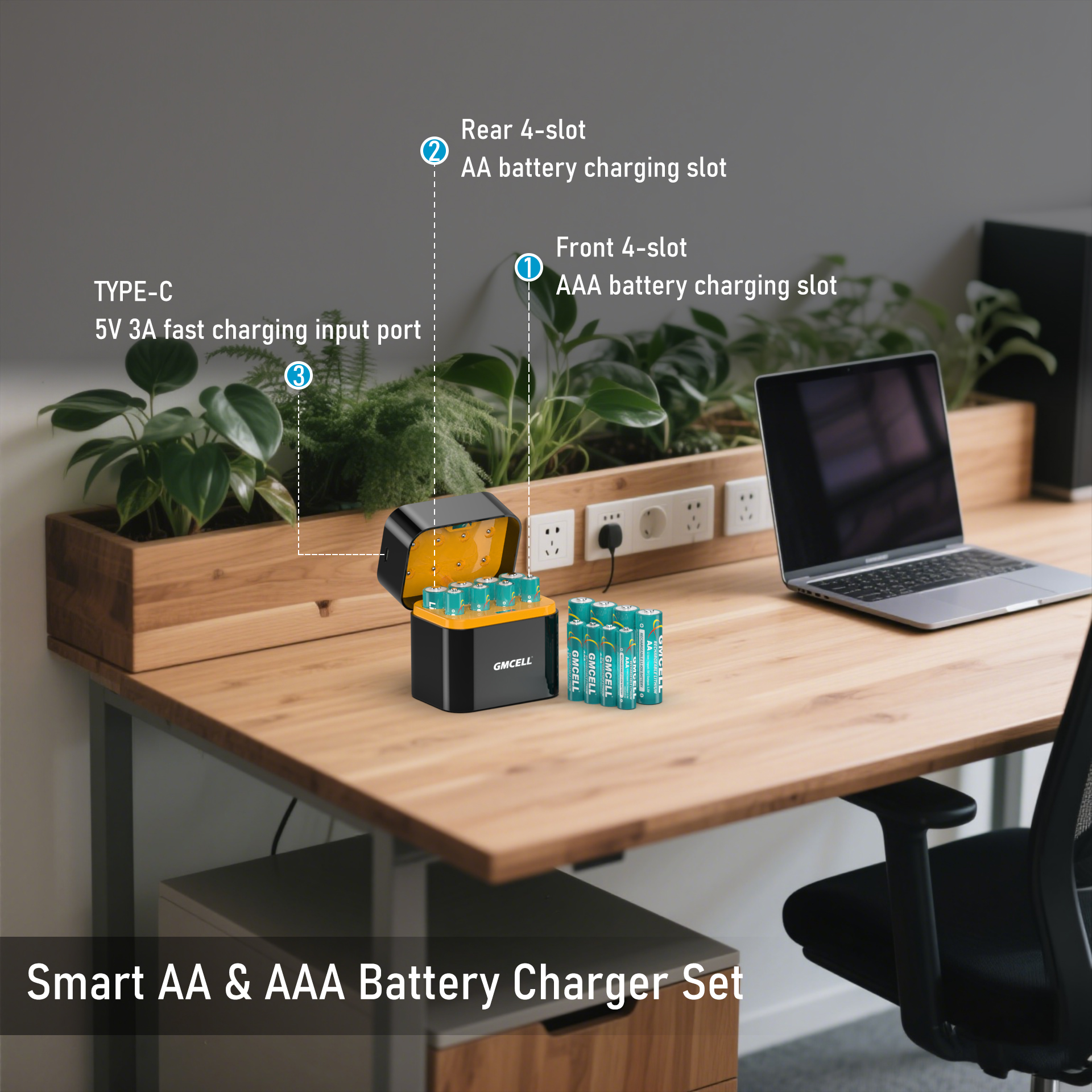 The GMCELL 8-slot intelligent charger set, which comes with 8 AA lithium batteries and AAA lithium batteries, has the following advantages: