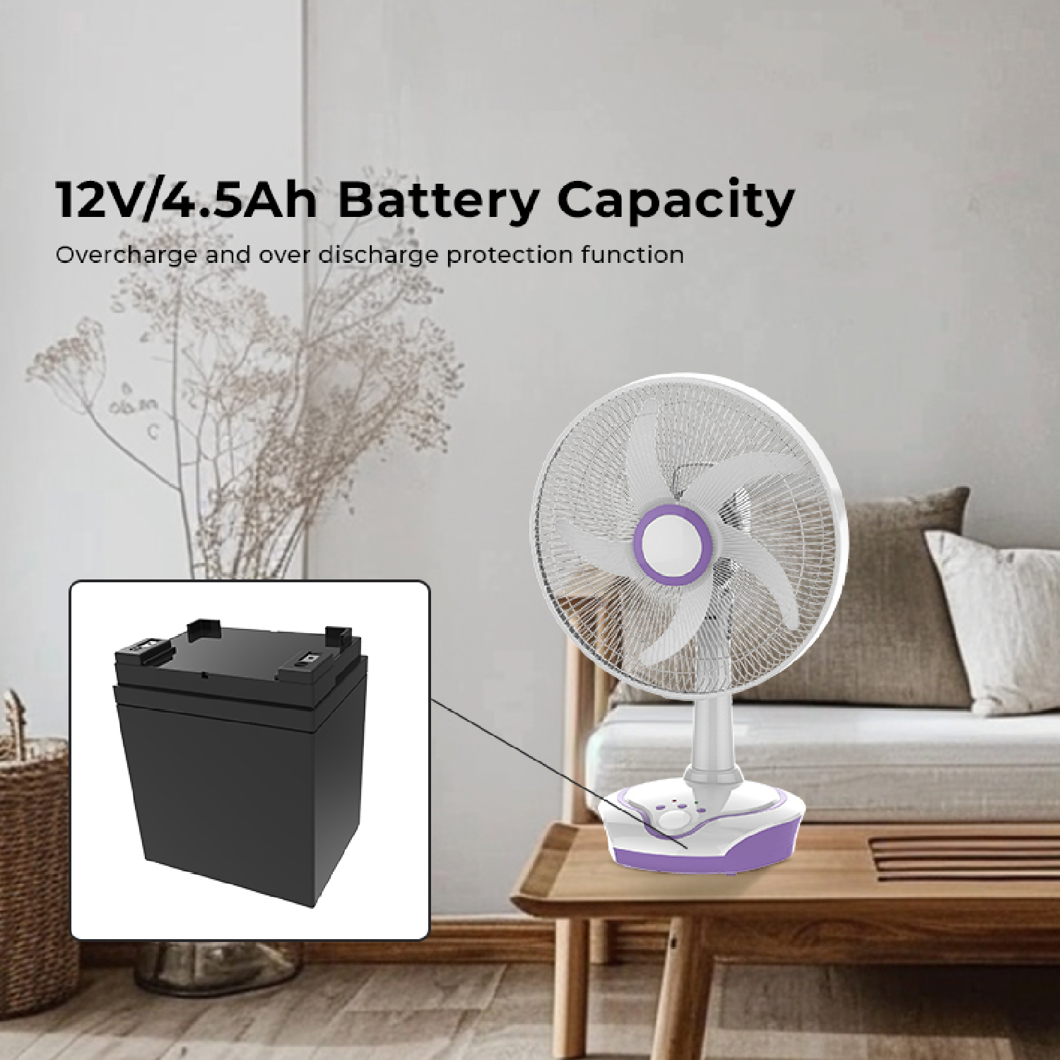 - Battery: 12V / 4.5Ah rechargeable battery with overcharge and over-discharge protection.