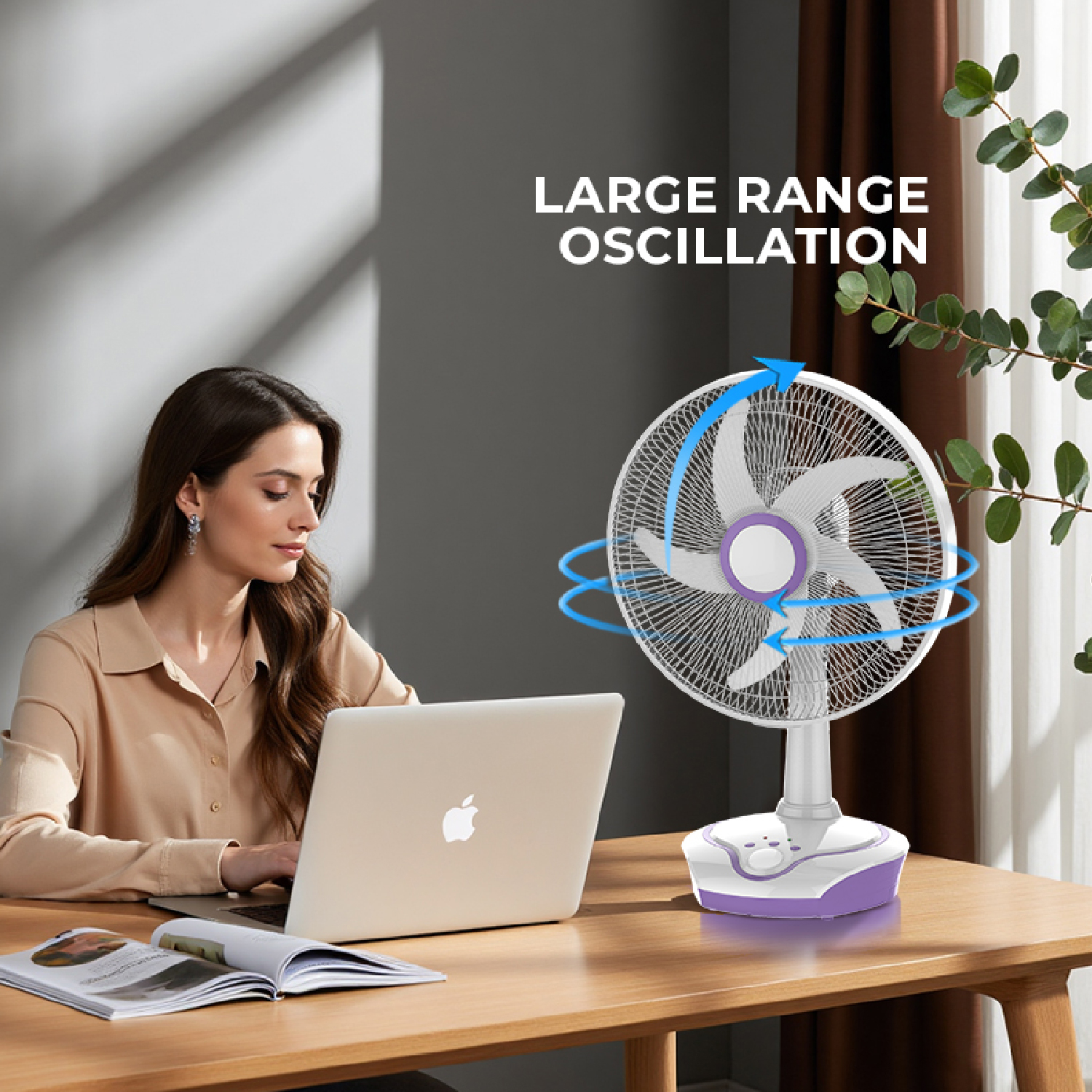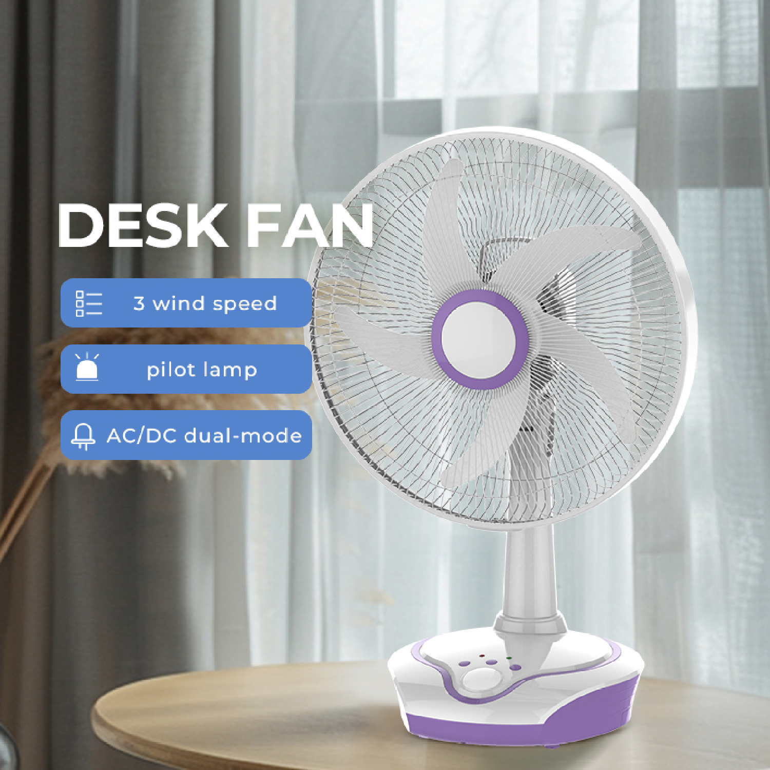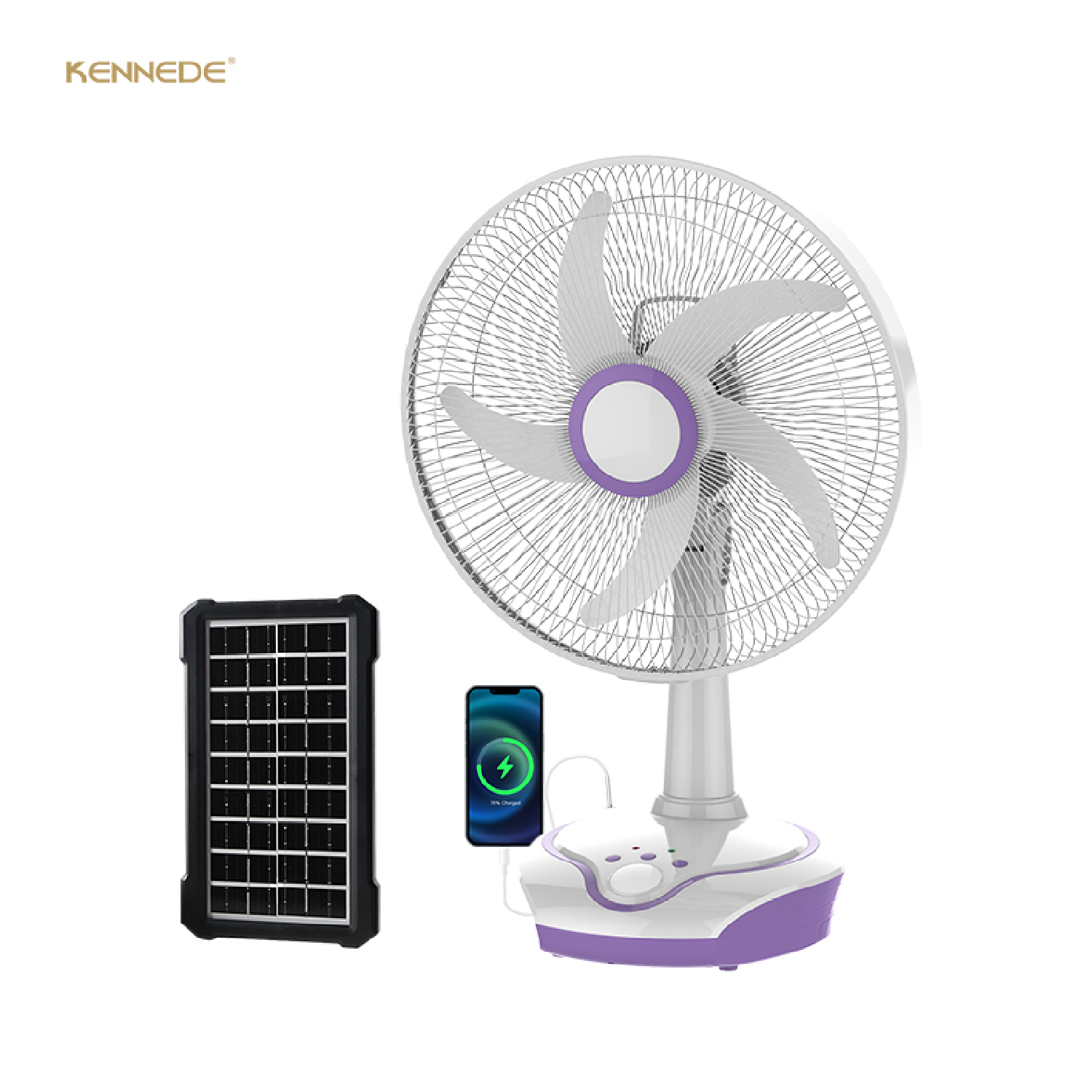 The KN-5602B is a 16-inch rechargeable table fan designed for versatile and convenient cooling with multiple power options.