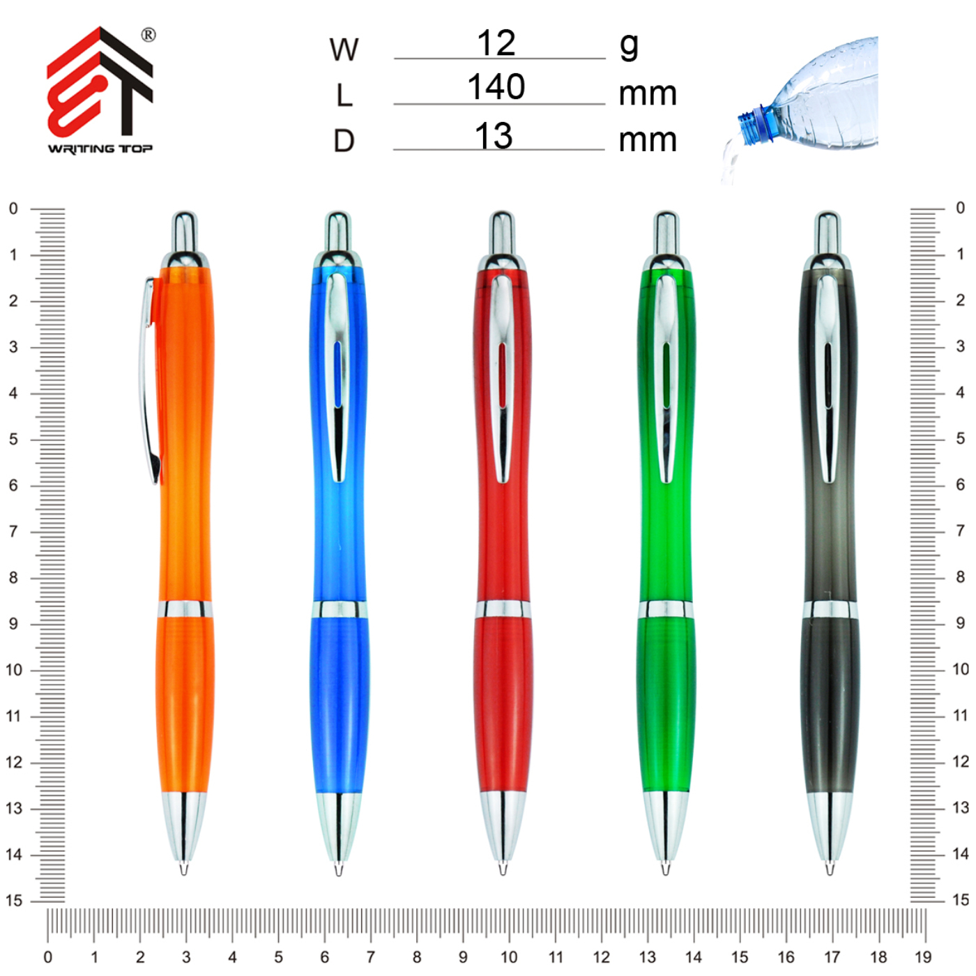 Transparent colorful plastic ball pen , middle barrel with a slant rings ,barrel is suitable for printing the logo.