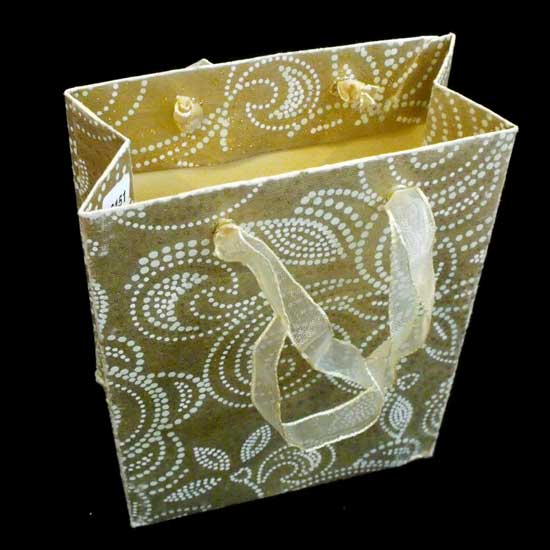 The paper bag features a rectangular bag body with a pair of fabric handles. The recycled paper bag is beautifully finished with dotted patterns for an attractive look. This paper bag makes a great choice for gift packaging.