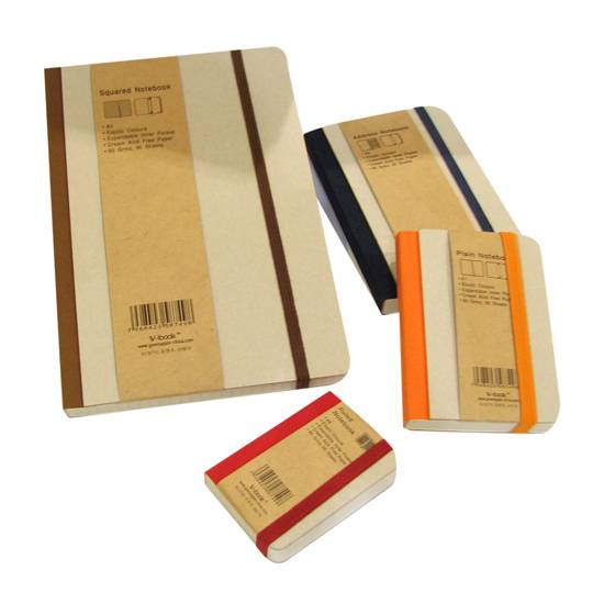 These note books are made of recycled paper. They come with elastic bands in matching colors which can be used for bookmark, paper clip or for vertical or horizontal wrap closure.