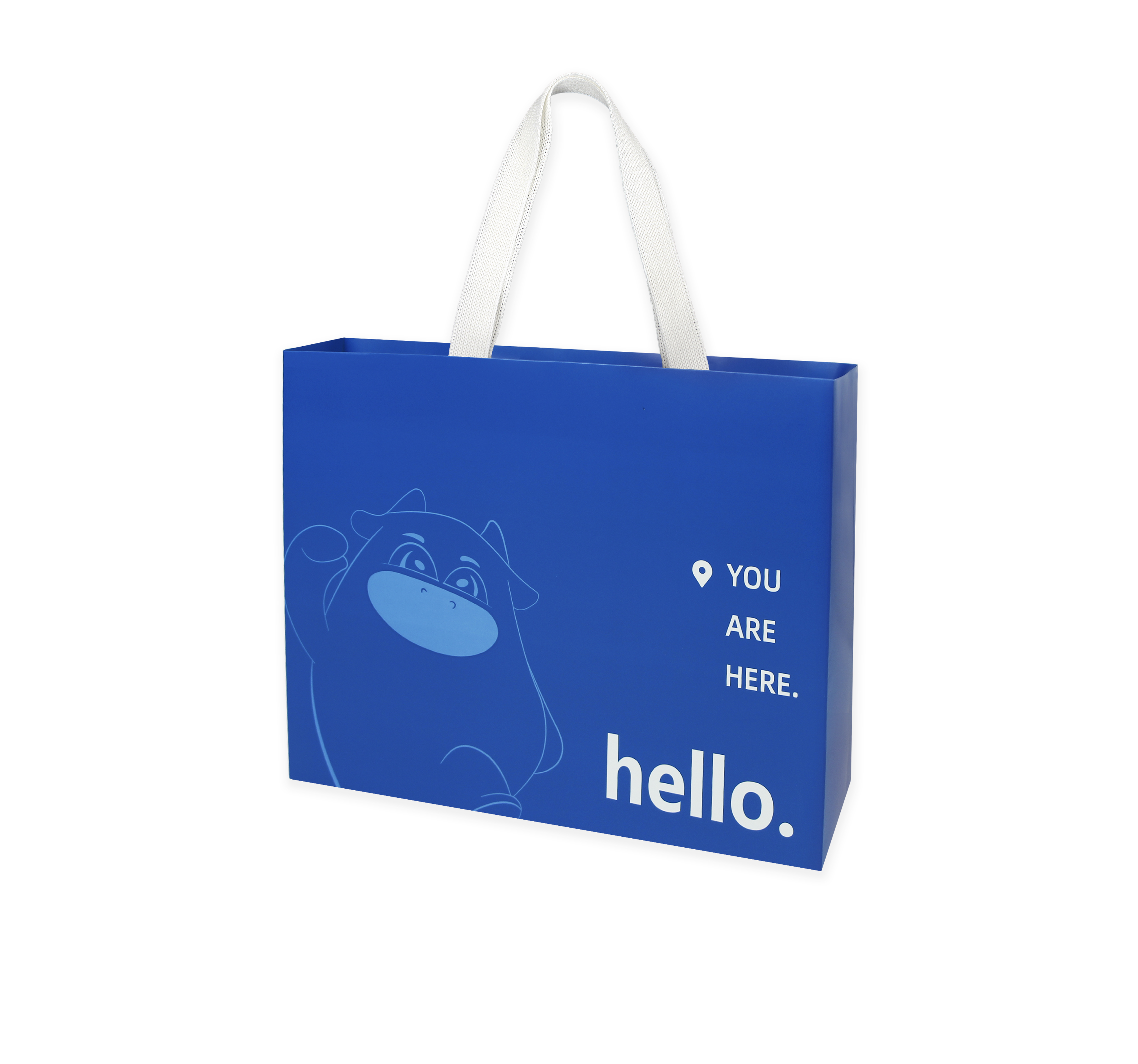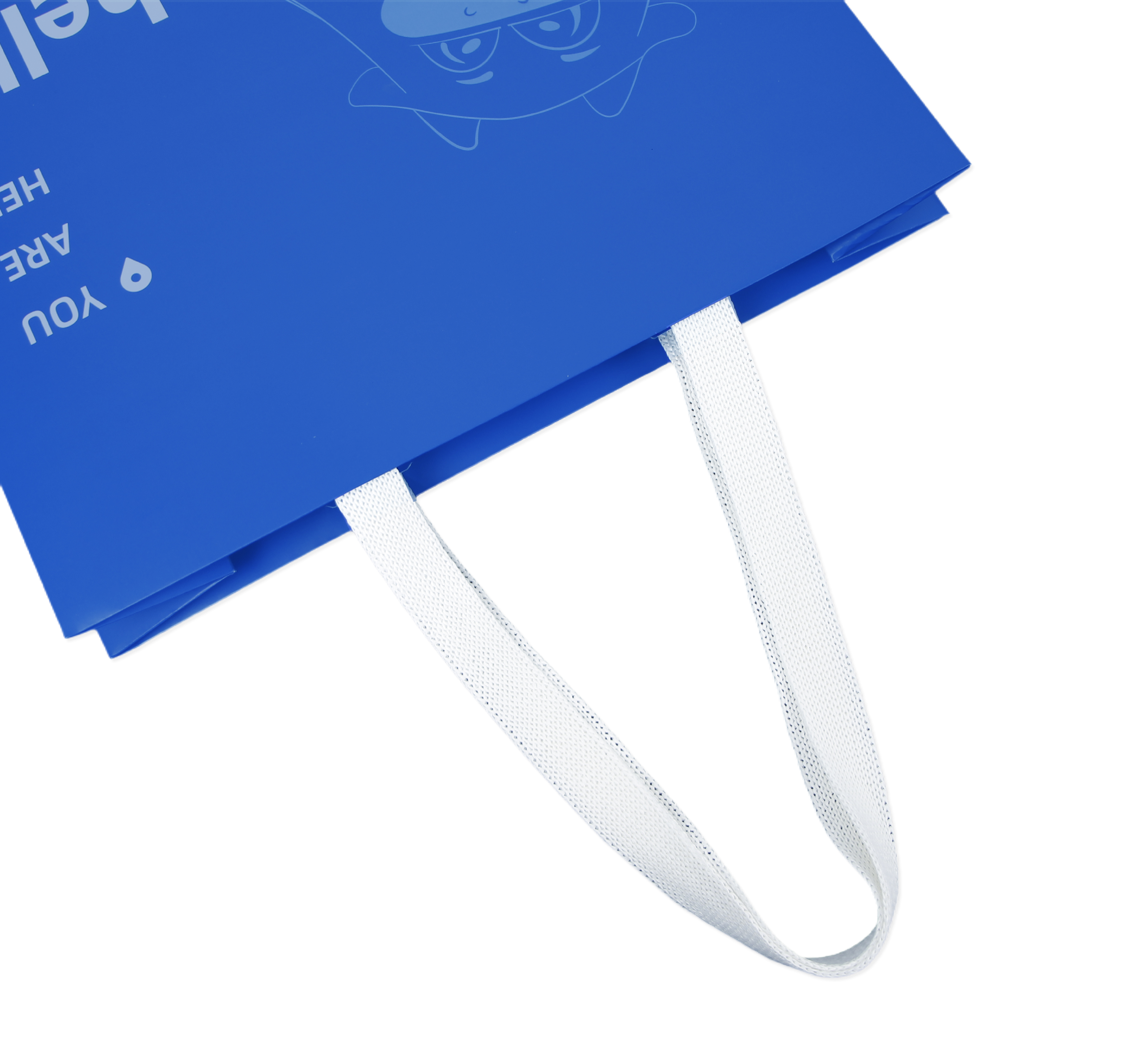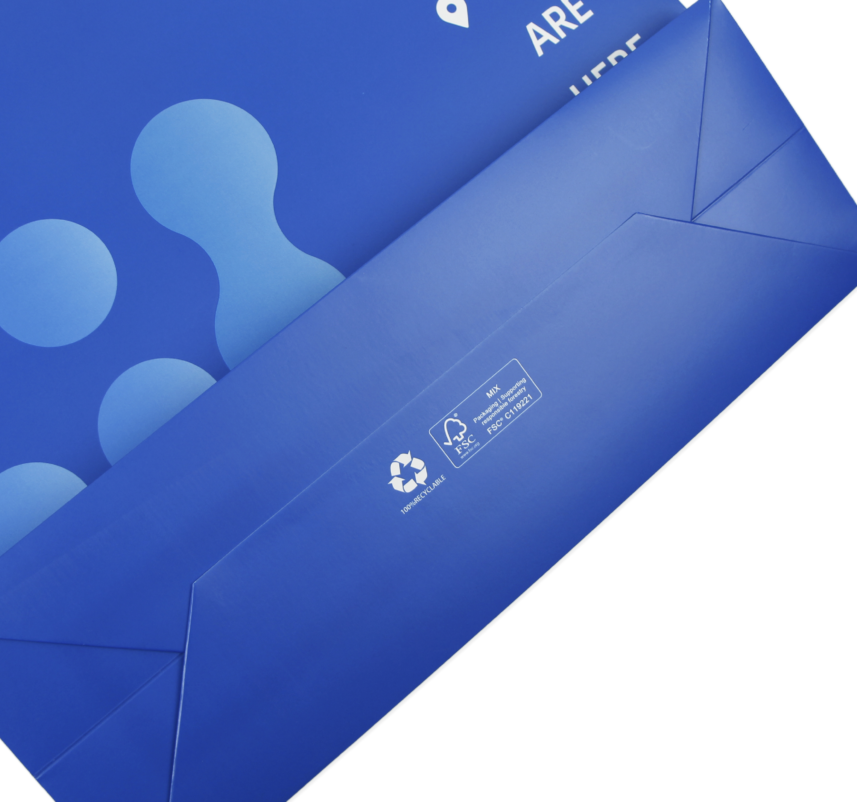 White kraft paper, printed in blue, with plastic replacement varnish, thick paper ribbon glued on top.
