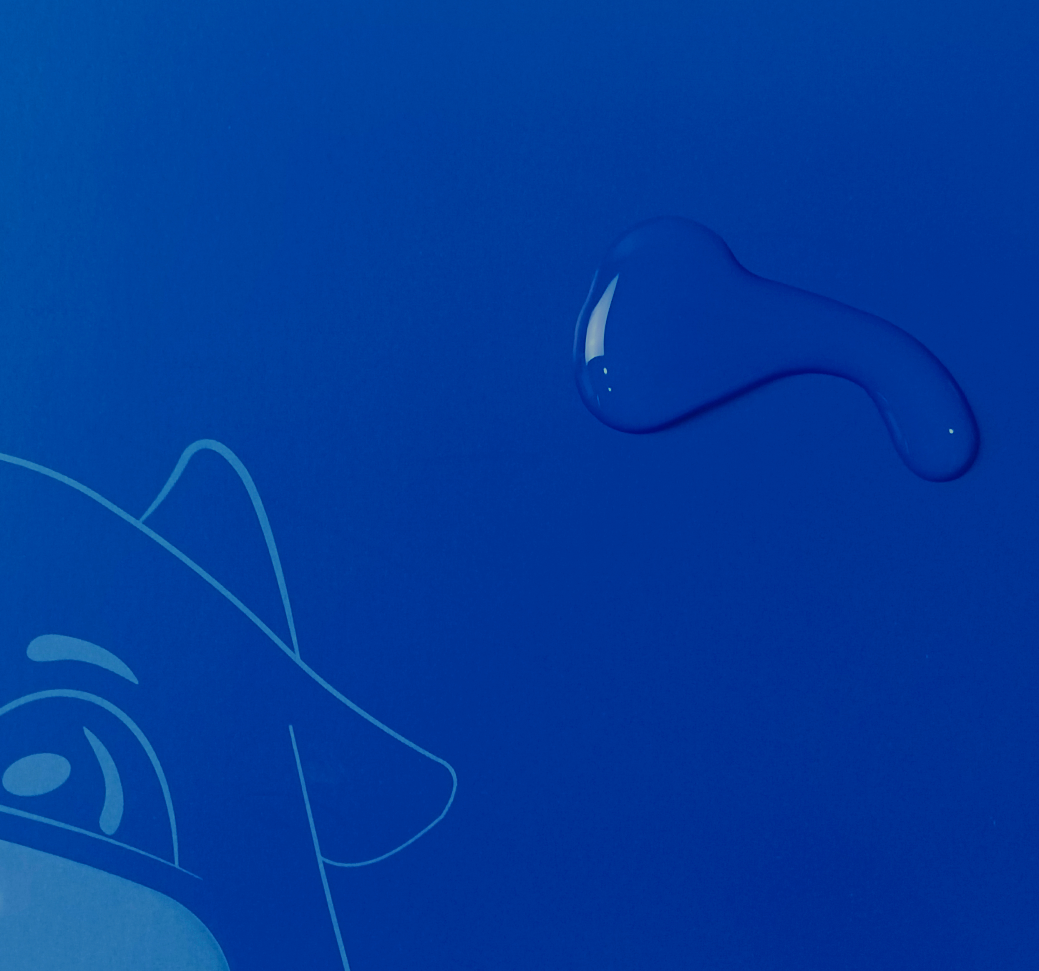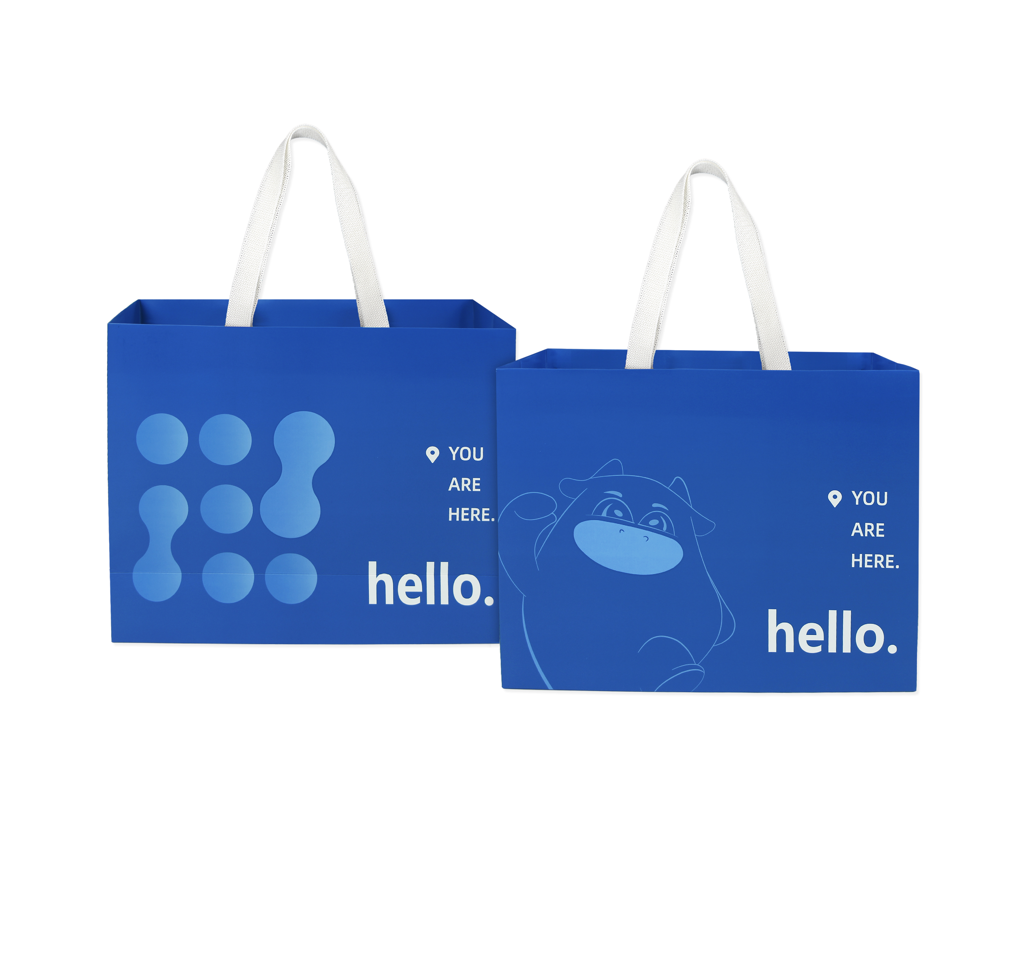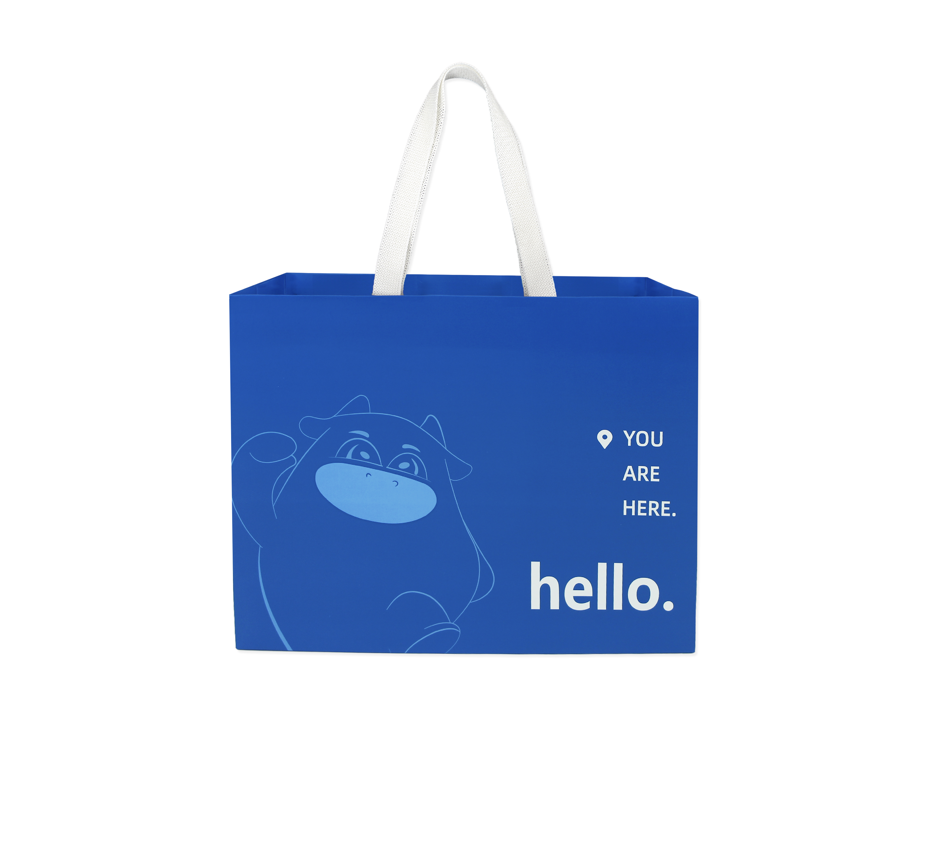 White kraft paper, printed in blue, with plastic replacement varnish, thick paper ribbon glued on top.