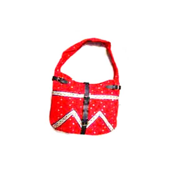 Pictured is a red cotton bag with beautiful golden embroidery on it. The handles of the bag are made long enough for carrying on the shoulder or simply holding by hand. This handbag makes the lady carrying it look cheerful and cute.