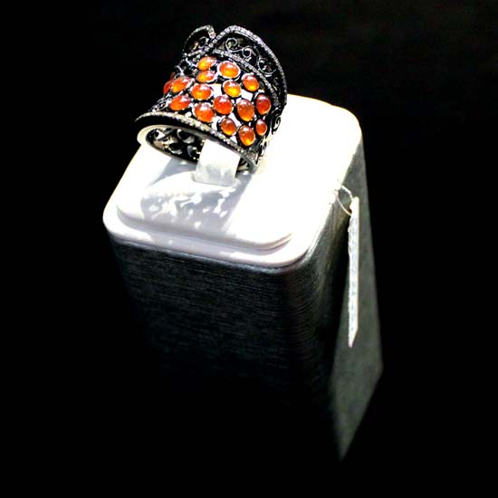 The red jade ring features an antique design with cut-off patterns. It has a black gold construction with meticulous attention to details. This fashion jewelry piece easily goes with any style.