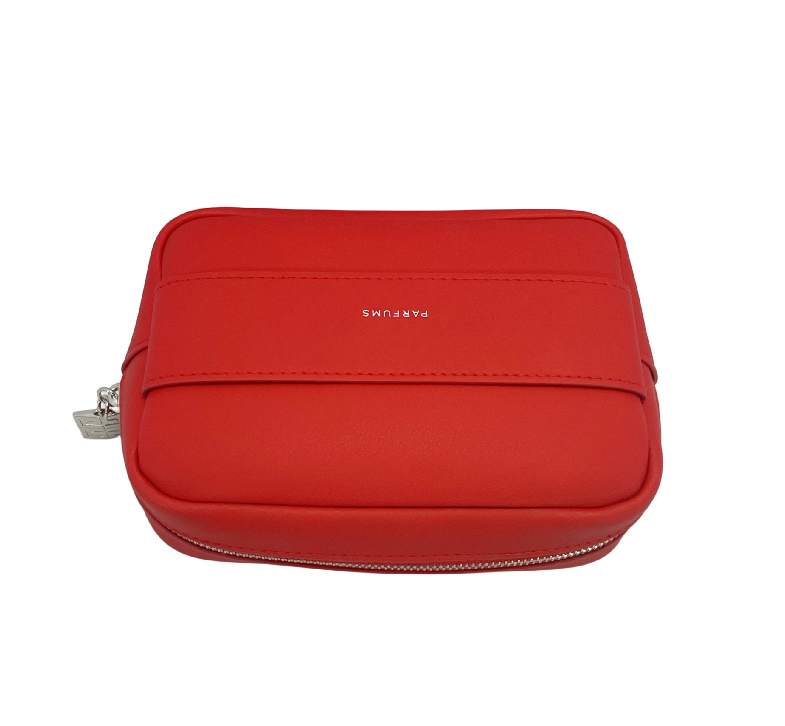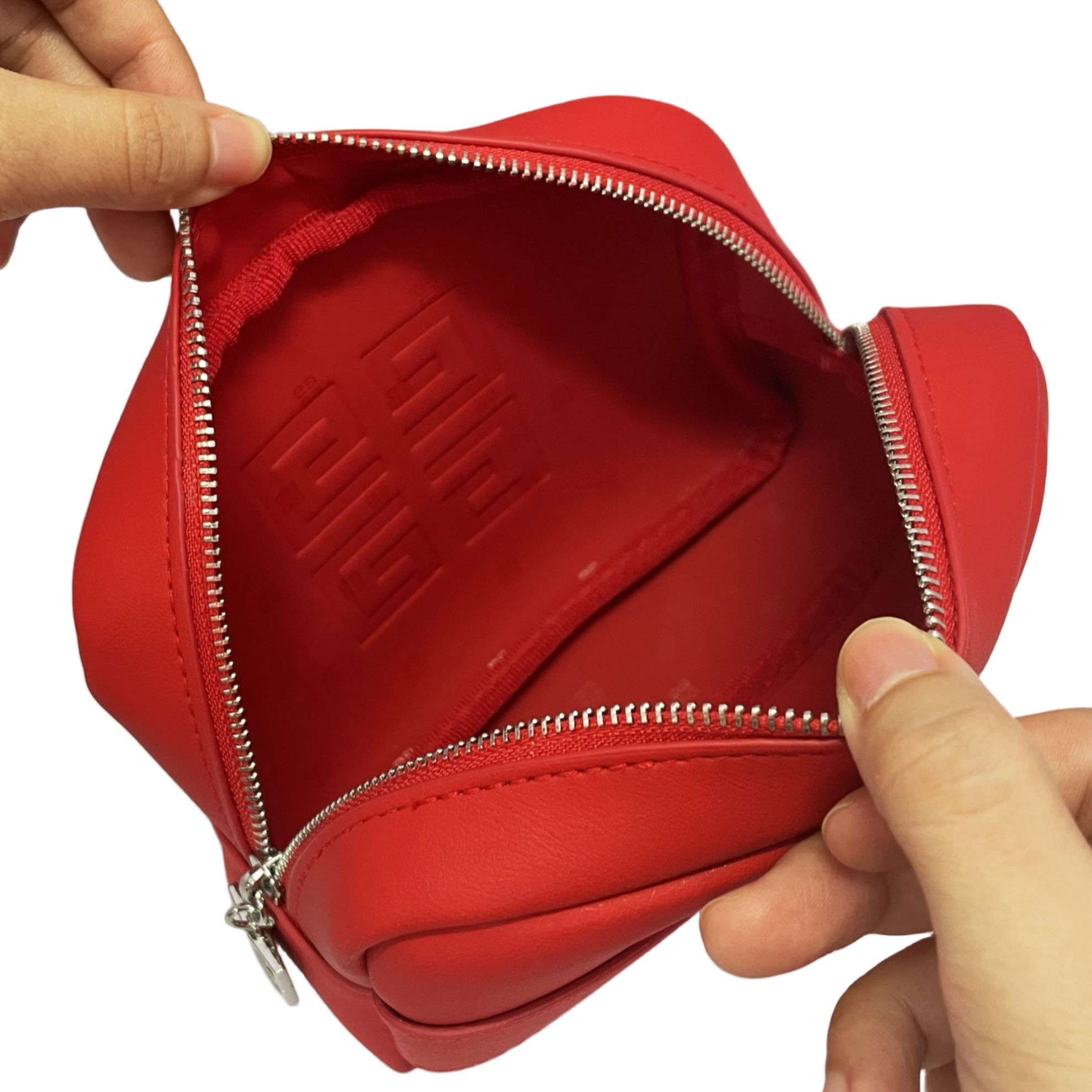 eco-consciousness. The rich red vegan leather provides a sophisticated yet striking look and a luxurious touch, making this makeup pouch a standout accessory for any beauty enthusiast.