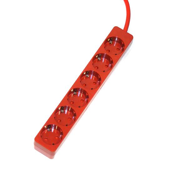 This is a red power strip. The designer filled the power bar with red paints leaving a shiny finish. The red power strip comes with a matching red electrical wire in the same design theme.