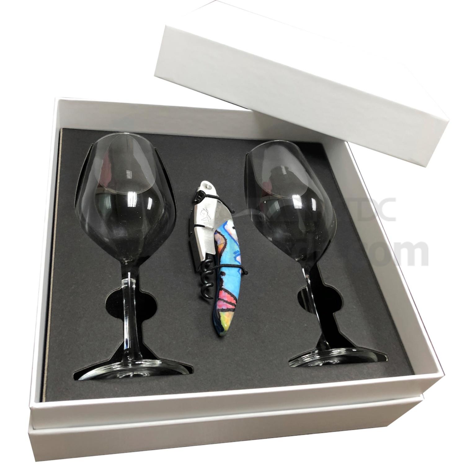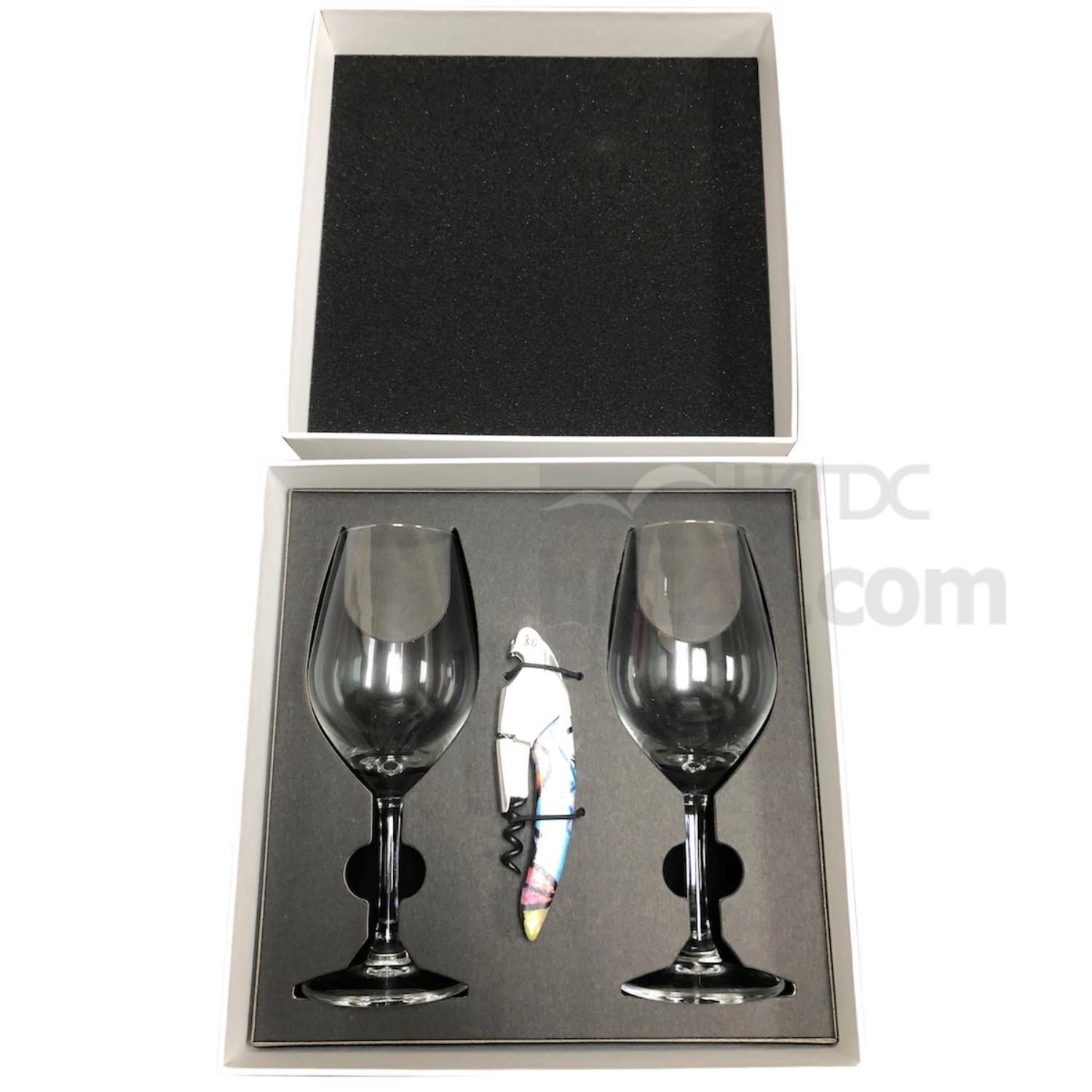 * Remarks: this box is designed for wine glass packing. In order to secure glass, there is making a paper platform with die-cut the shape to fit with pair of glasses. In between of glasses, it's fixing a crockscrew by using elastic band. In addition, palcing 5mm foam at bottom on top respectively of inside outer box to pretect glasses in futher.