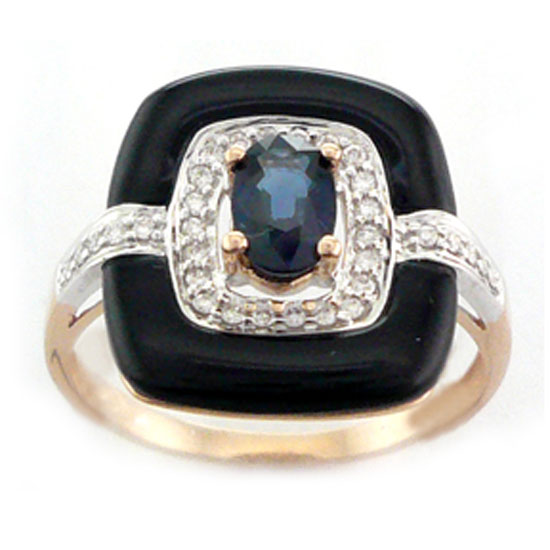 Presented here is a delicate ring in a polished red and white gold setting. It features a fancy-cut onyx and a sapphire in the center accented with diamonds, showcasing added brilliance. This sophisticated red and white gold ring complements your elegant look in a dainty way.