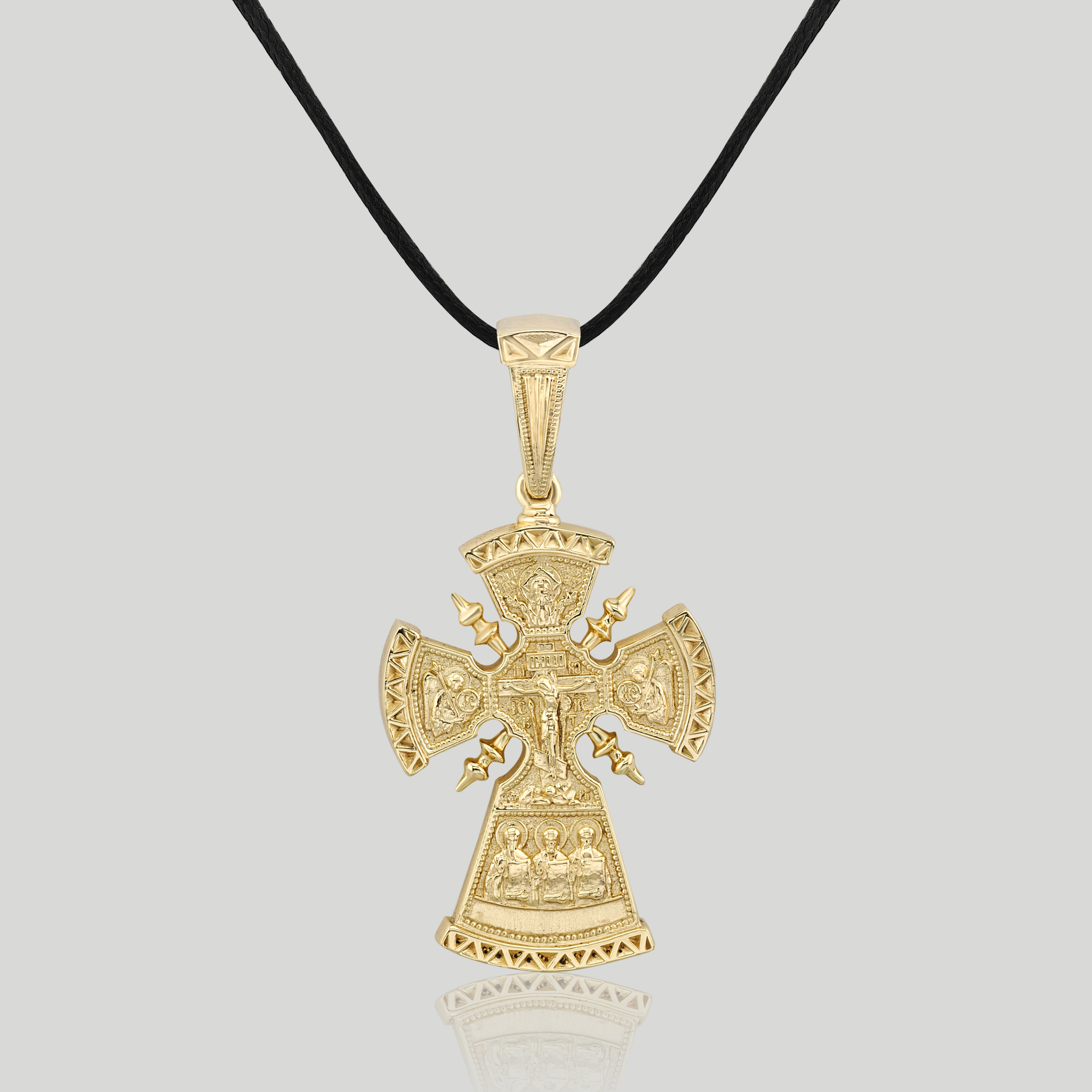 This is an ornate, gold-toned Christian cross pendant featuring intricate, detailed carvings that depict religious scenes and symbolic motifs. Its elaborate, traditional design reflects deep spiritual significance, making it a meaningful accessory for those seeking to express their faith with a touch of historical artistry.