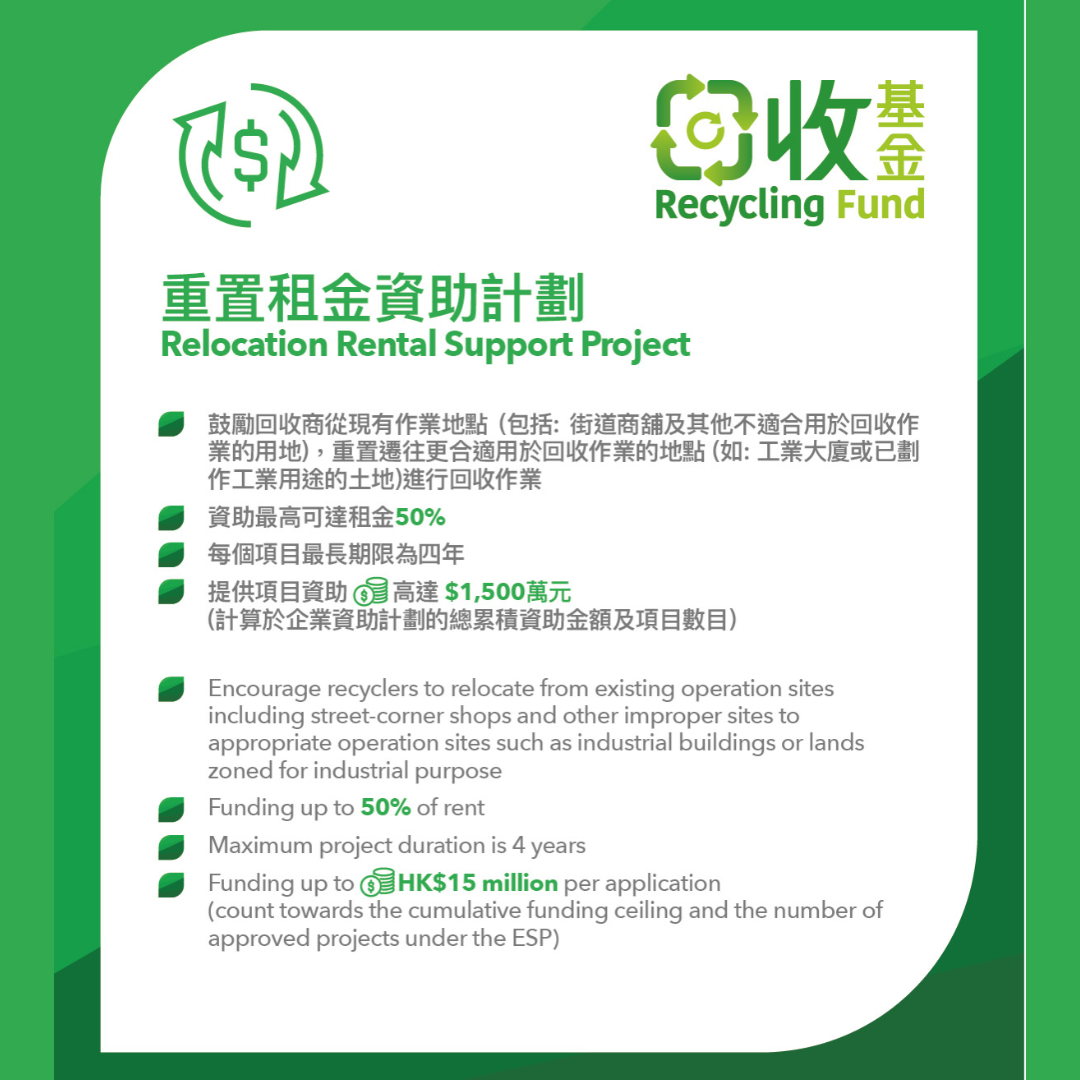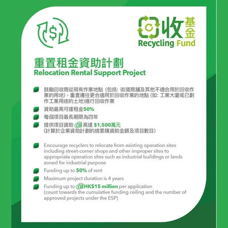 Relocation Rental Support Project encourages recyclers to relocate from existing operation sites including street-corner shops and other improper sites to appropriate operation sites such as industrial buildings or lands zoned for industrial purpose. Funding would be granted on a matching basis, i.e. the Government will cover a maximum of 50% of the total approved project cost and the applicant has to contribute no less than 50% of the total approved project cost. The funding ceiling for each RRSP application is HK$15 million.