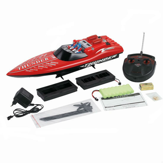 Get ready for some epic boat racing action with this remote control boat. Speeding through the water to perform handsome turns, it promises a streamlined housing and fetches eye-catching prints on the front deck for added appeal. The included recharger and remote control further ensure versatility and convenience when on the go.