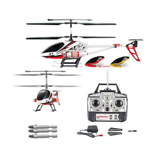 Presented here is a remote-controlled helicopter of sturdy construction. Fitted with a powerful 4-channel design, this toy helicopter flies upward, downward, forward and backward. It can also move to the left or to the right. This remote-controlled toy helicopter is easy to control.