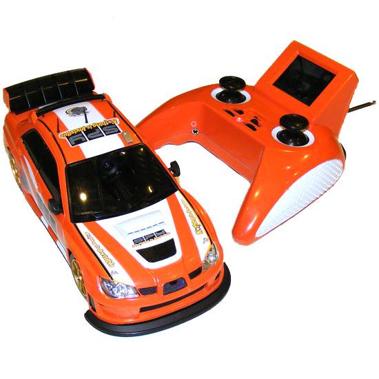 This is a remote control toy sports car with four wheels. The AA battery-operated remote control has a display and some sound effects. The toy car has a suspension function.