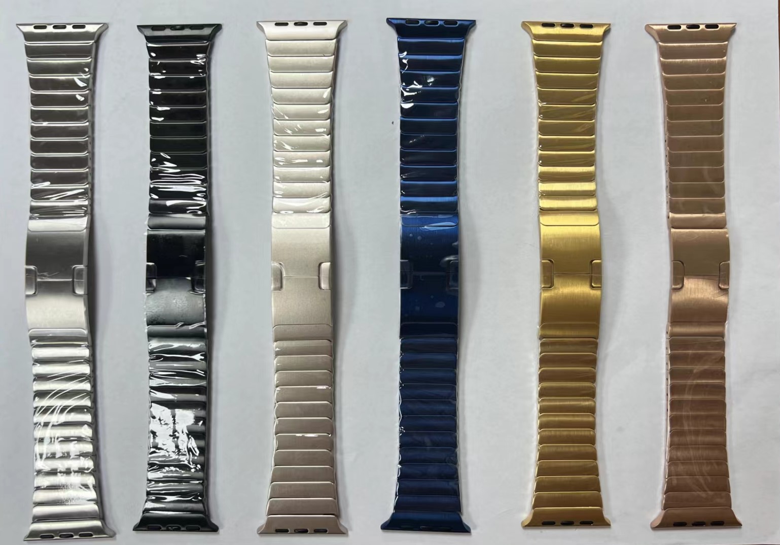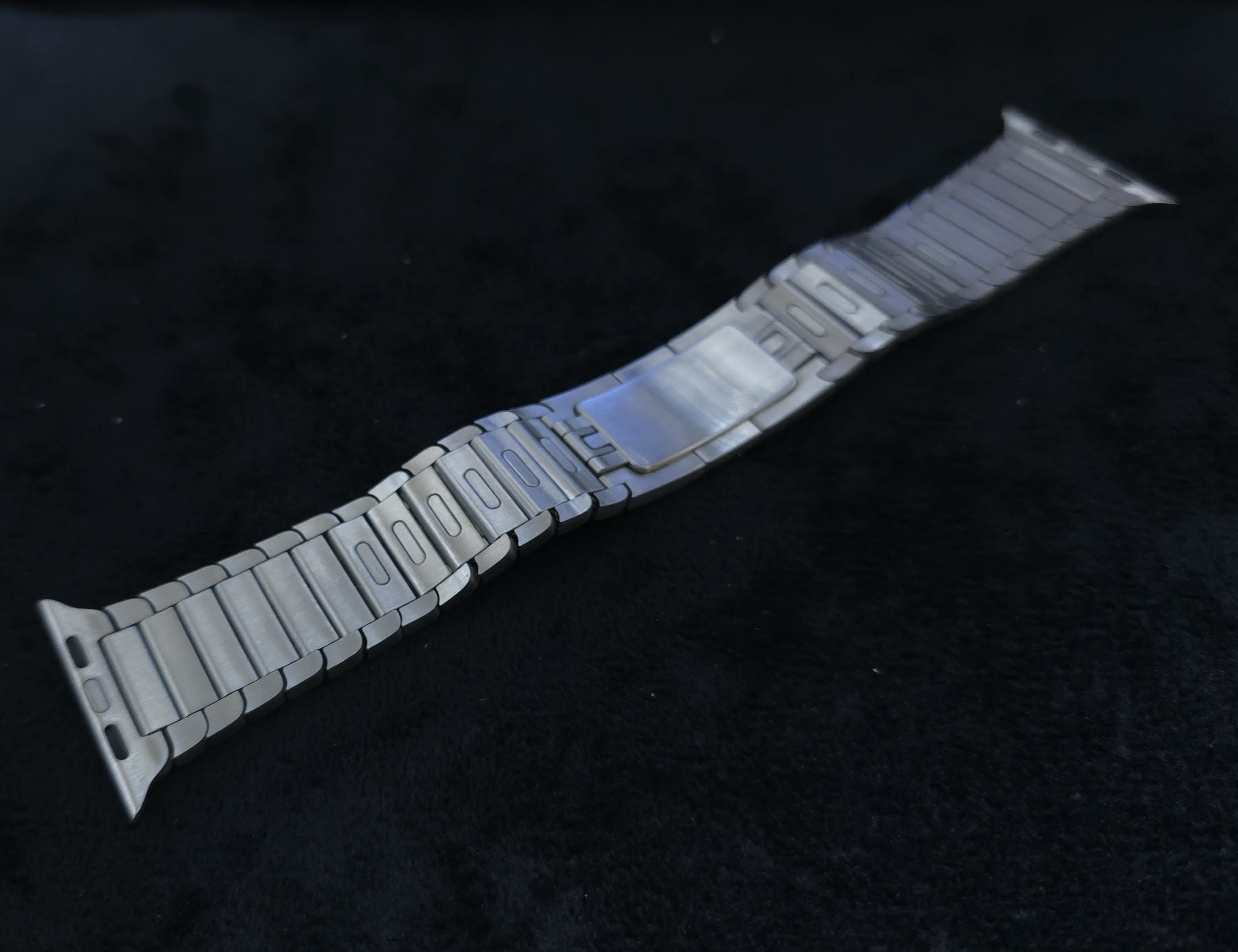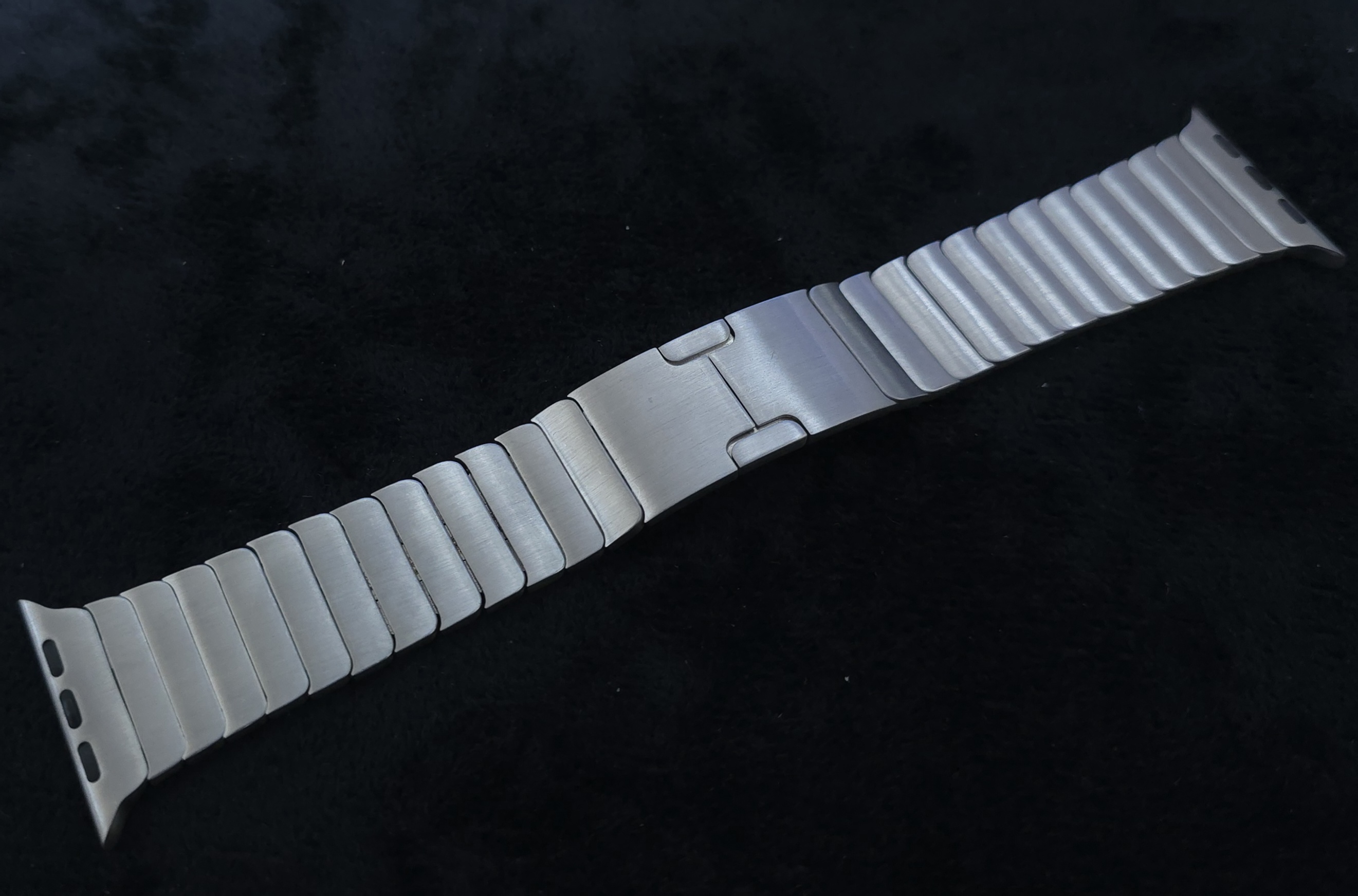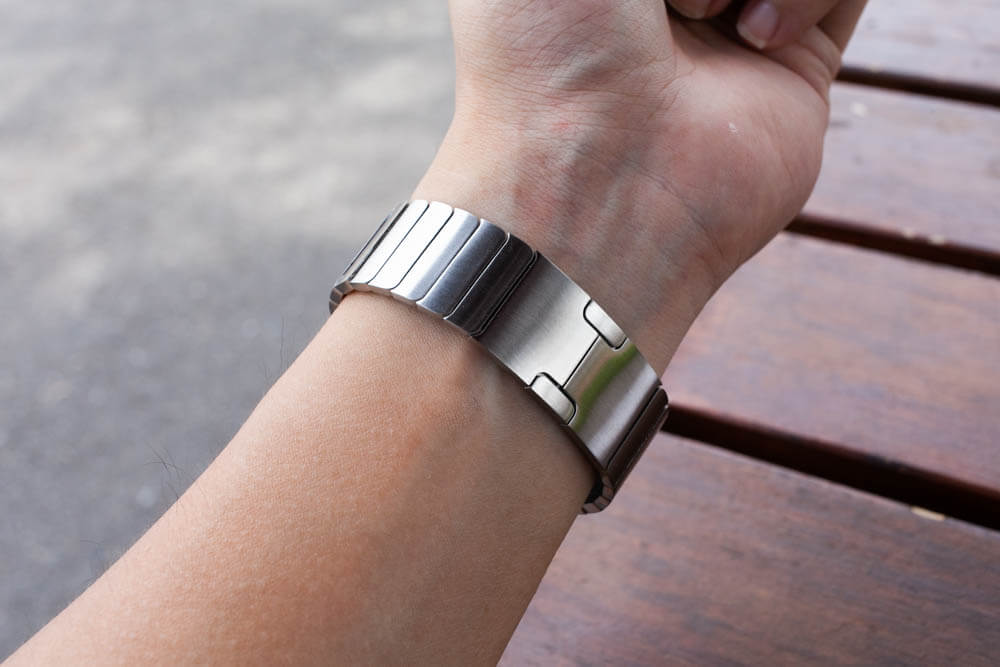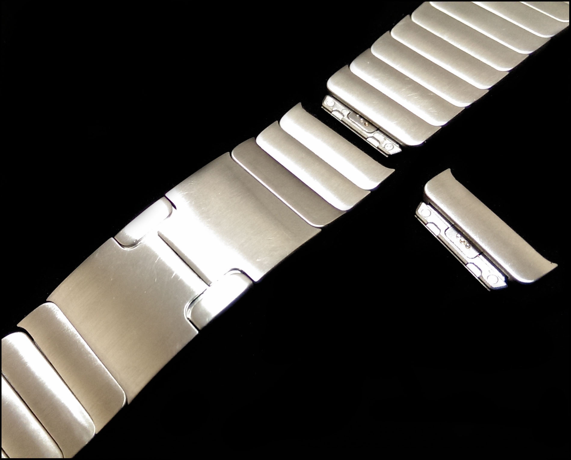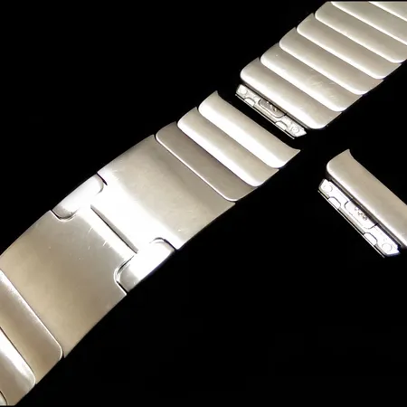 Brushed silver stainless steel Apple Watch band with removable links for easy size adjustment—sleek, durable, and customizable.