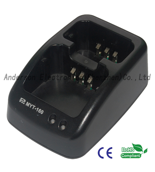 The pictured desktop two way radio battery charger is designed for Icom F24 and F16. It has two charging ports and offers separate charging for the two way radio and the battery. This two way radio battery charger has two indicator lights to show the charging status and is convenient to use.