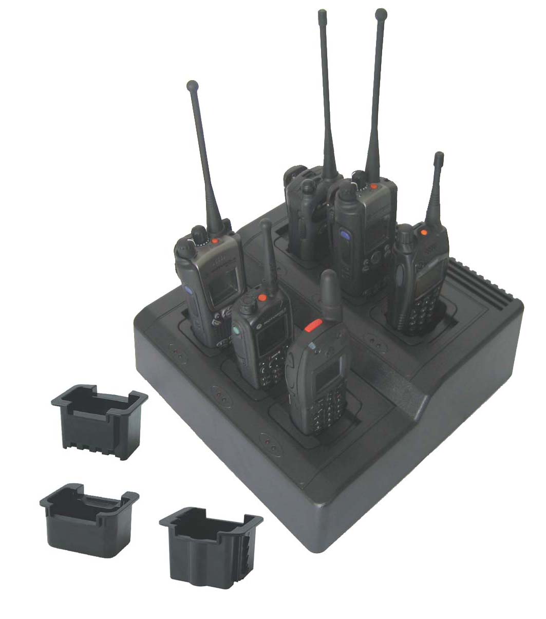 Charge up to six two way radios at the same time with this AC two way radio battery charger. It is square shaped and is equipped with 6 interchangeable charging slots. This two way radio battery charger has indicator lights for each charging slot and is compatible with two way radios of different brands.