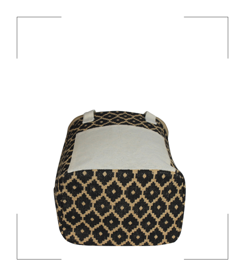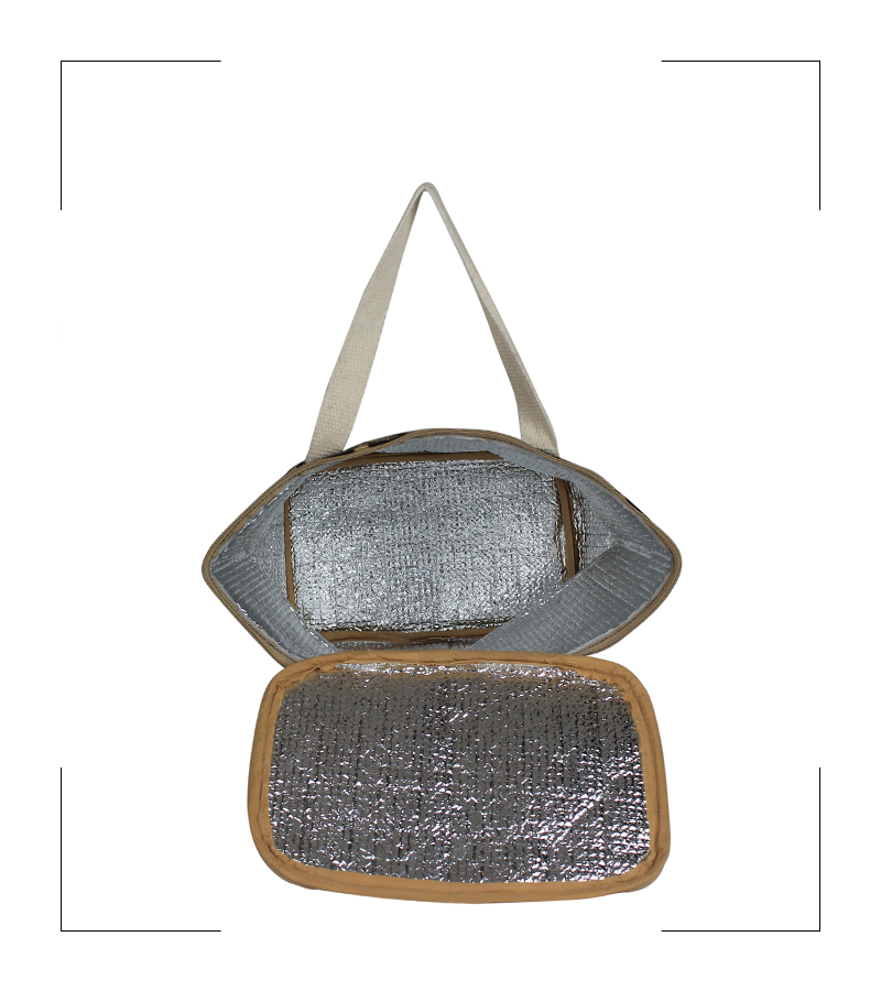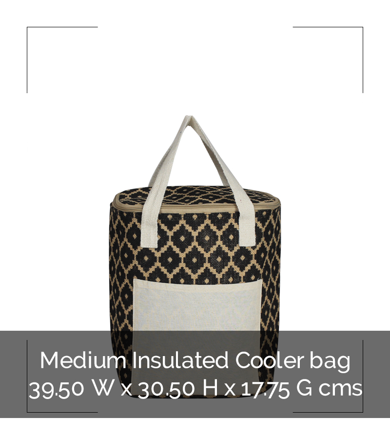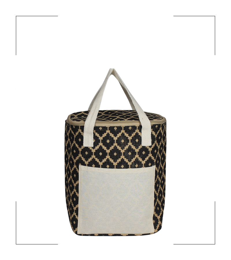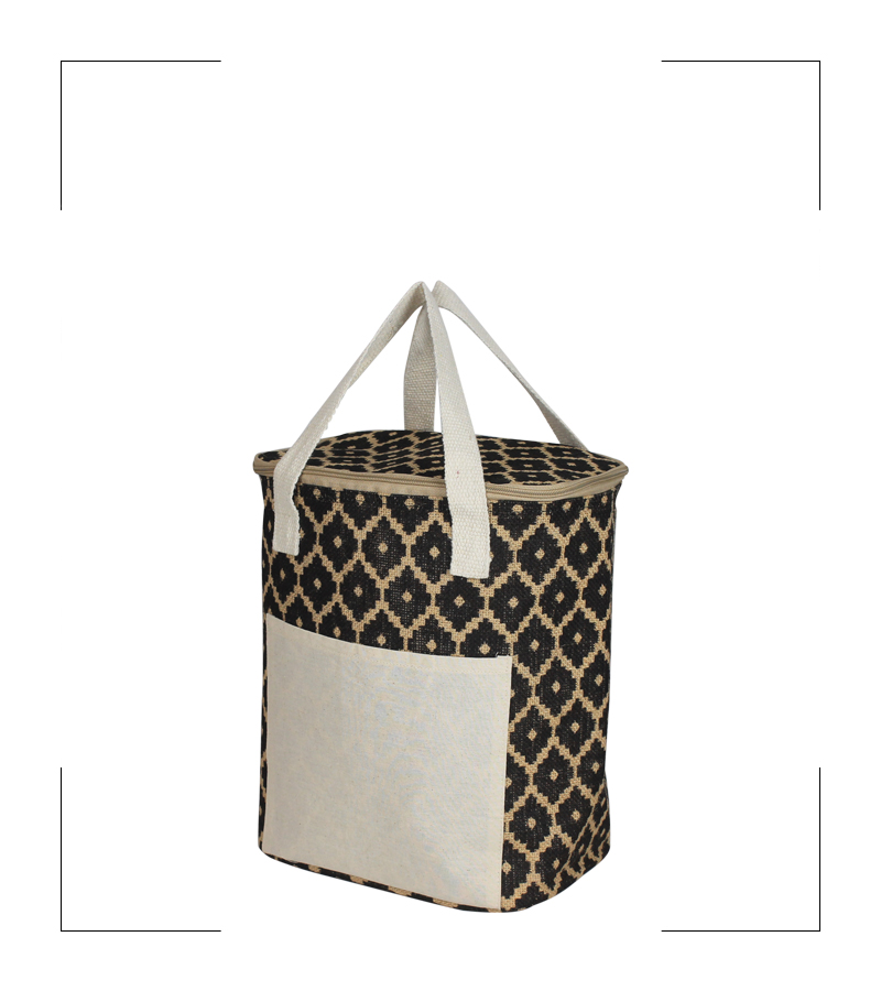 Laminated Jute with Insulation Liner. Cotton webbing handles & 4 Oz Cotton Front Pocket.