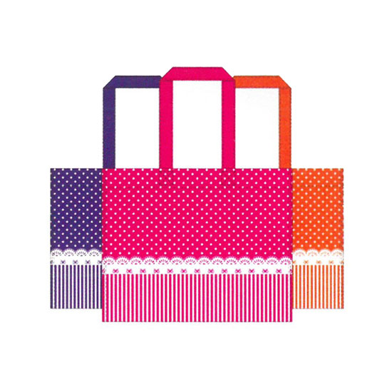 This is a shopping bag featuring a rectangular body and sturdy handles. The white dot and lace prints accent this design for a touch of elegance. The high-quality nonwoven material promises a long service life.