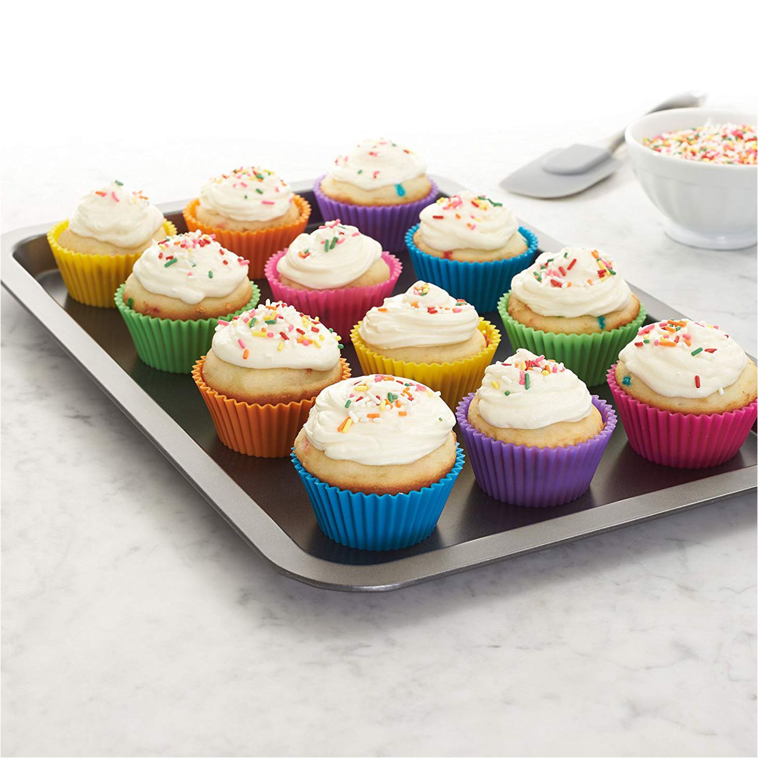 • 12-pack of reusable baking cups; made of food-grade silicone; ideal for baking, lunch/snack cups, and more