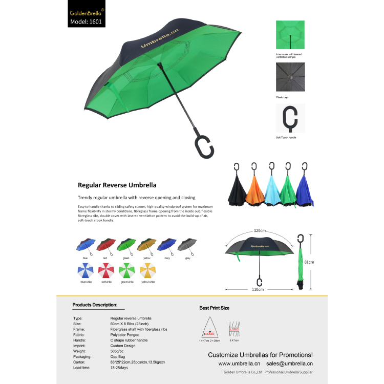 A clever design to maximize convenience. The umbrella with an inverted design is opening and closing in reverse, which keeps the dry side on the outside to prevent water drip off the canopy when close the umbrella after use. With a sturdy frame formed by durable fiberglass shafts and fiberglass ribs, the umbrella can withstand the test of powerful gusts even during challenging weather conditions. Its canopy is made of high-quality recycled PET fabric to shield users from harmful rays in hot weather. Besides, applying a C-shaped rubber handle, the umbrella is comfortable to grasp and easy to carry. It is an ideal umbrella to keep in cars.