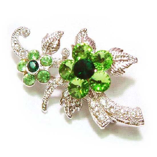 This is a rhodium-plated brooch that is beautifully accented with glittering Swarovski or Stellux stones. It features hues of eye-catching green and silvery for a sense of luxuriousness. This grand brooch is easy to mix and match with your high-fashion dress.