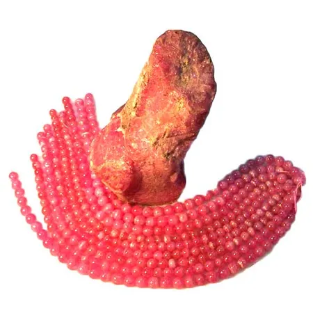 Displayed here are some rough and round beads of AAA-grade rhodochrosite. Its vibrant bright red glow will beguile any jewel lovers. These spectacular rhodochrosite gems make a glamorous addition to your jewelry collection.