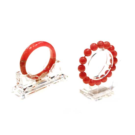 This is a bangle and a bracelet in red with sparkling luster. They are made of natural rhodochrosite stones with professional workmanship. These jewelry items are accessories for your high-fashion outfit.
