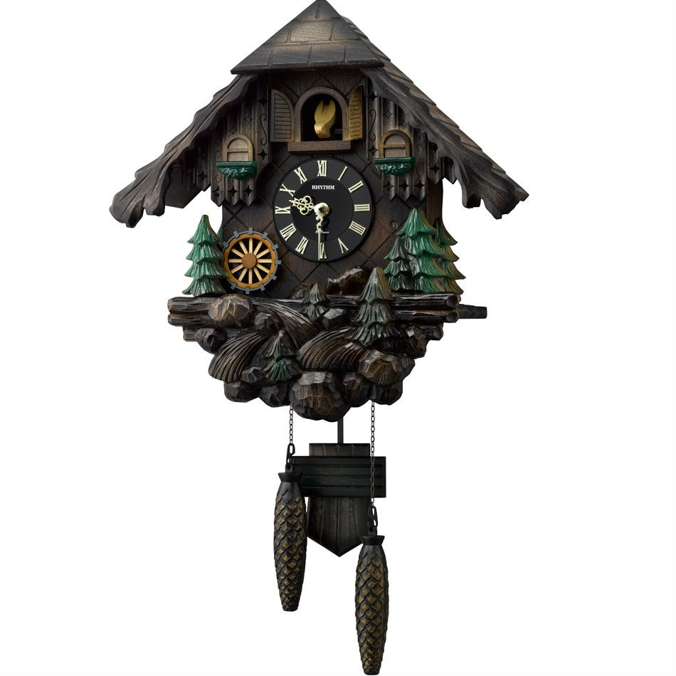 Designed in a forest house with a shingled roof, trees and other detailed cravings, this wooden clock comes completed with authenticity. A bird comes out and chirps to count the hour followed by water mill rotations with melody, offering both visual and audio effects on timekeeping. Traditional and beautiful, this cuckoo clock adds rustic accents to any interior style.