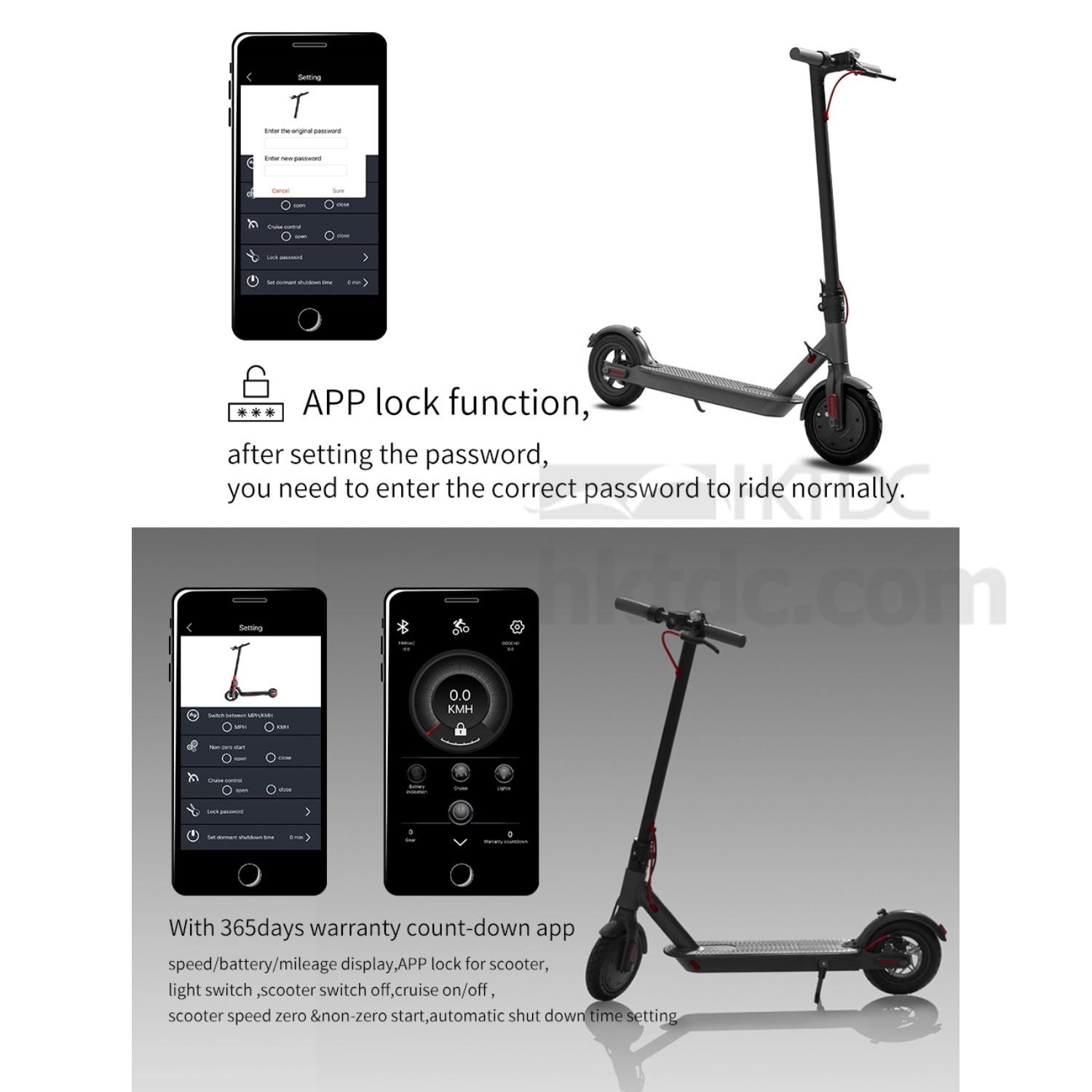 - With 365 days warranty count-down app, speed/battery/mileage display, APP lock for scooter, light switch ,scooter switch off, cruise on/off ,scooter speed zero &non-zero start, automatic shut down time setting