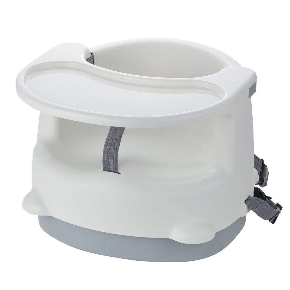 Convertible baby chair for use on the floor or attached to an adult dining chair. Features two seat heights, a tray that holds the child securely, antibacterial treatment and an easy-clean design.