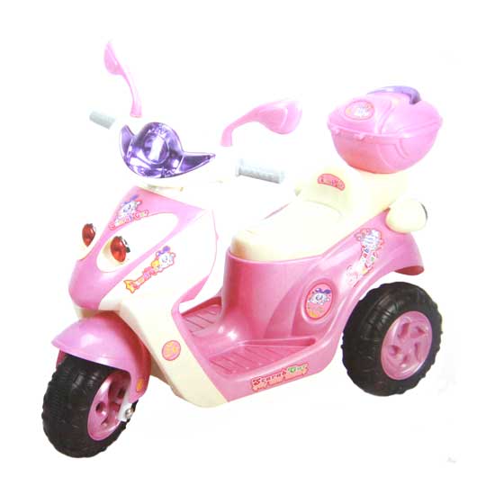 The pictured ride-on toy features a motorcycle appearance. The eye-catching pinkish design catches people’s attention easily. This ride-on motorcycle is a fun toy for kids to play with.