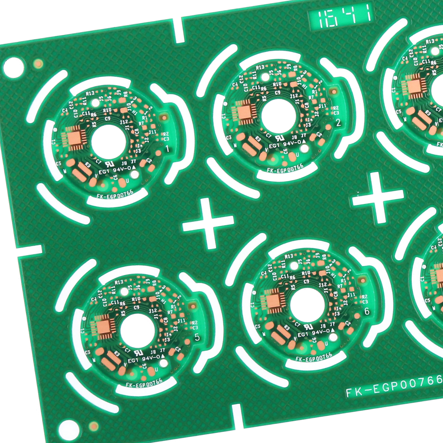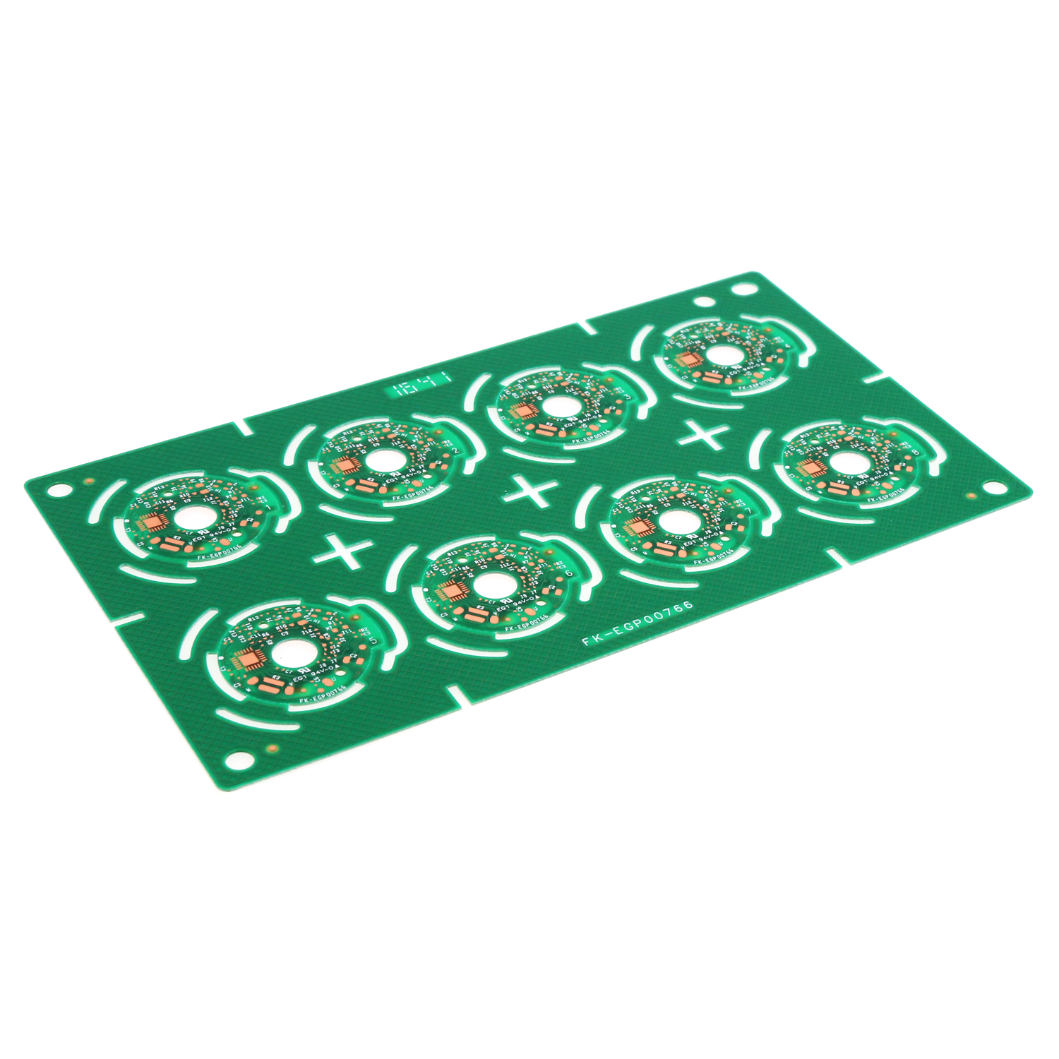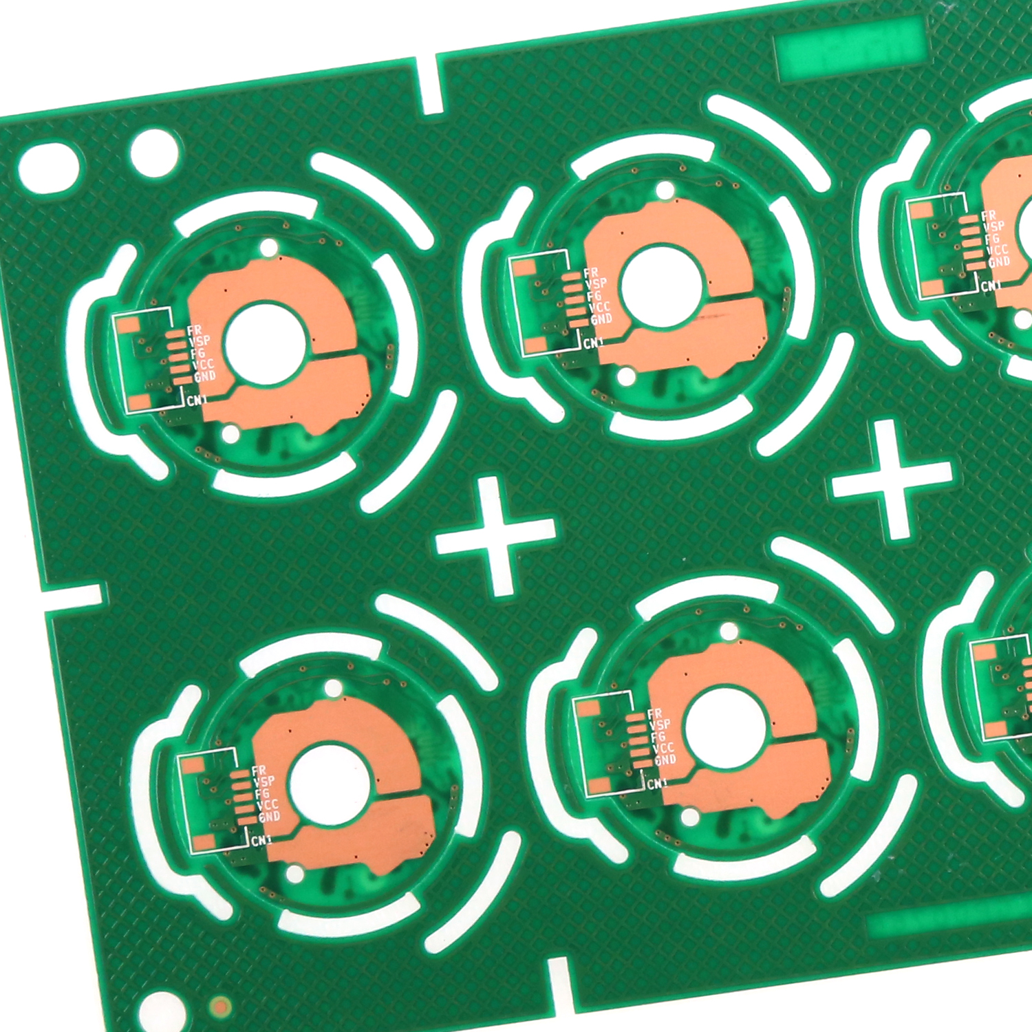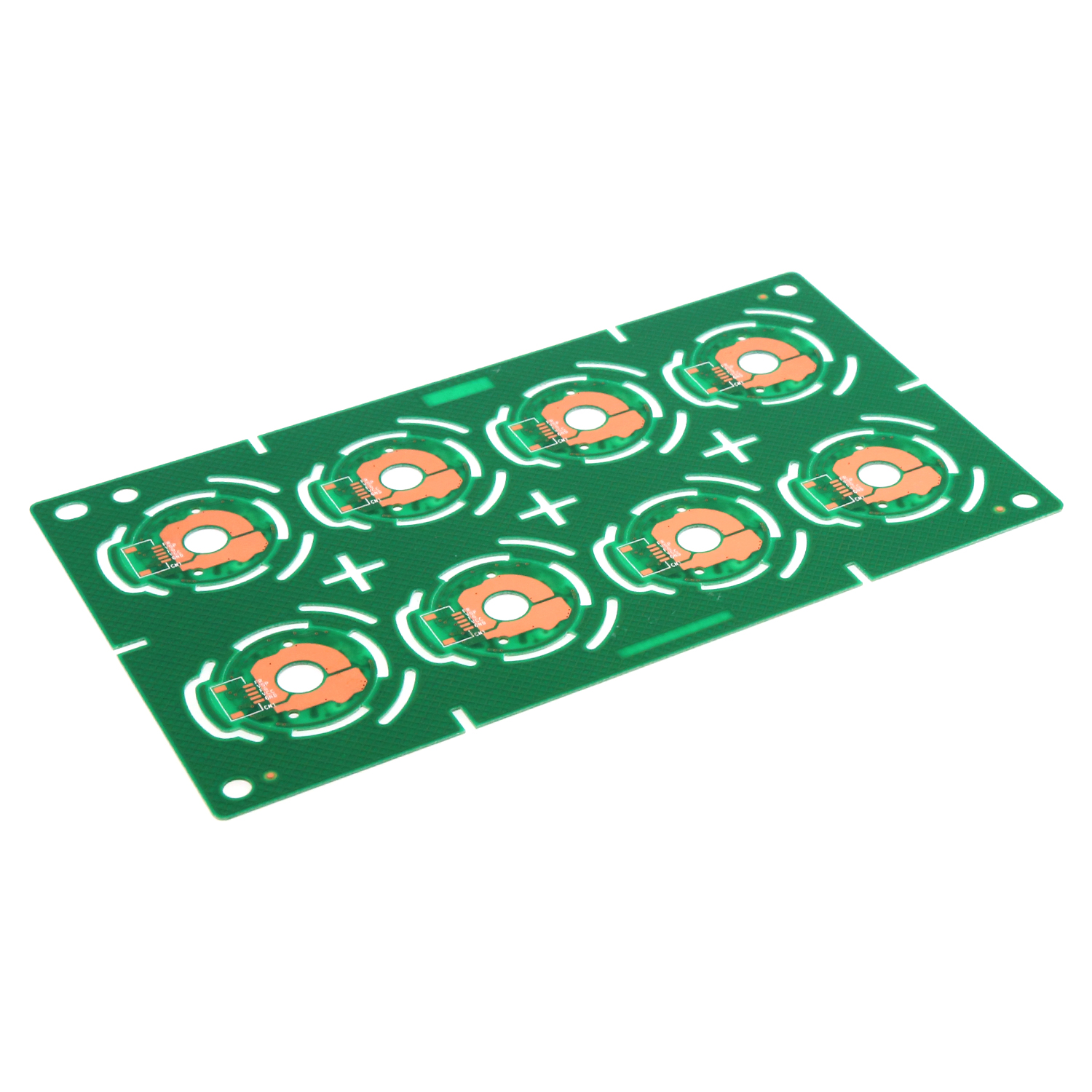This PCB takes on a quadrilateral panel design, comprising 8 circular accents with soldered circuits, resistors, transistors to boast functionality. Its thin housing further highlights punched holes at corners that ease installation in computers, motors and more.
