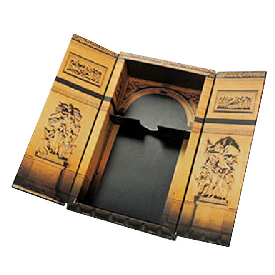 This rigid packaging box boasts a double-door design for added uniqueness. The double doors open to reveal an arch printed on the interior, while the interior features an insert to secure the item in place. This rigid packaging box makes a perfect packaging option for a variety of products.