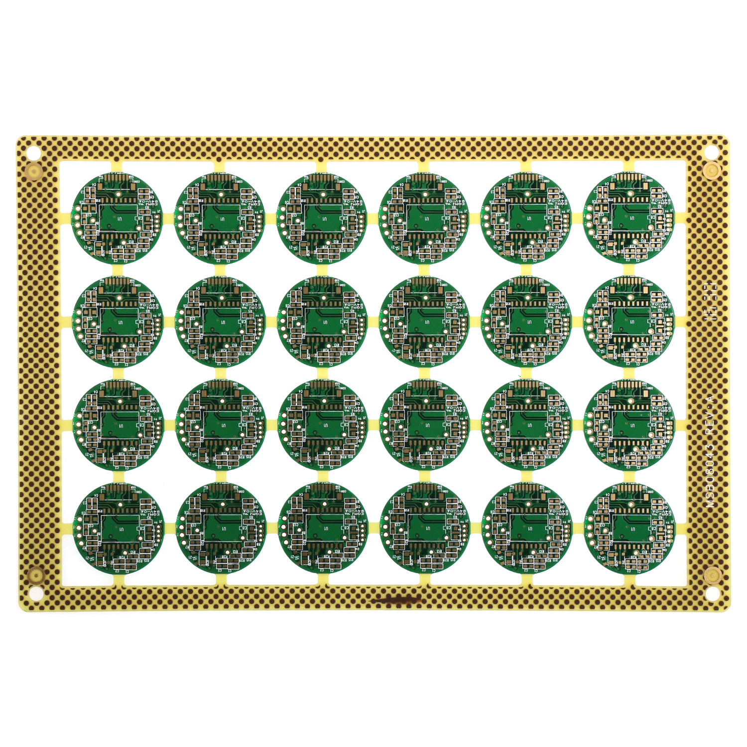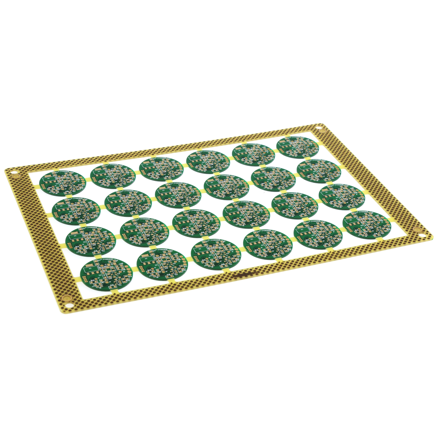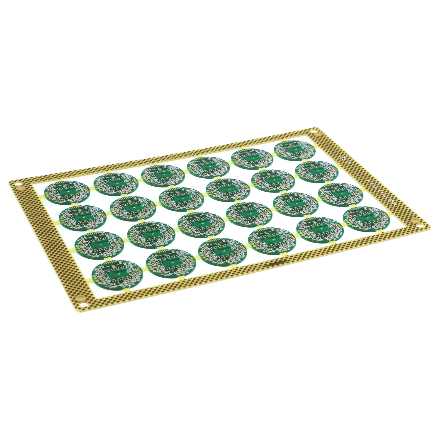 The pictured rigid printed circuit board comes in a compact round shape and has a 4 layered structure. It has a green solder mask and has an immersion gold with thick gold finish. This printed circuit board is simple to assemble and is suitable for sensors and GPS use.