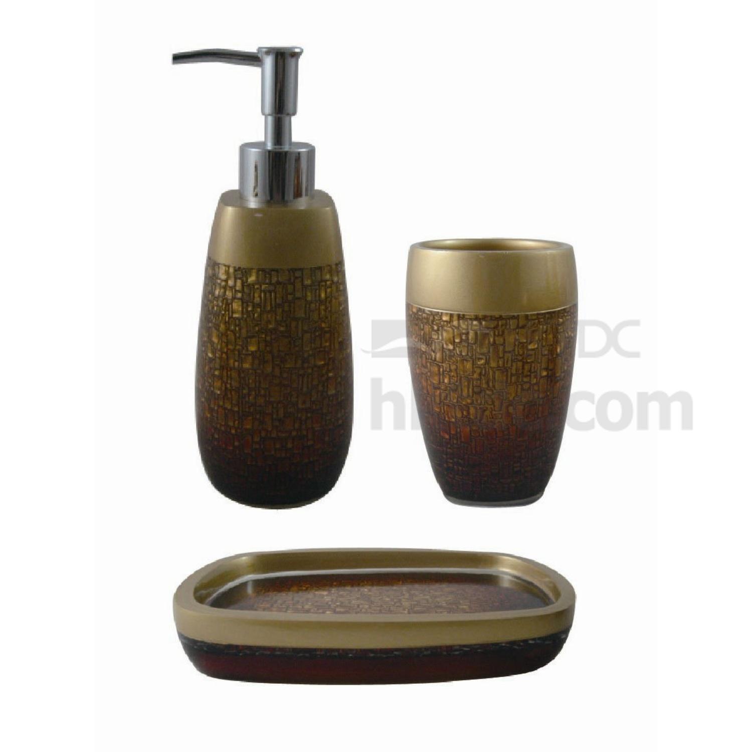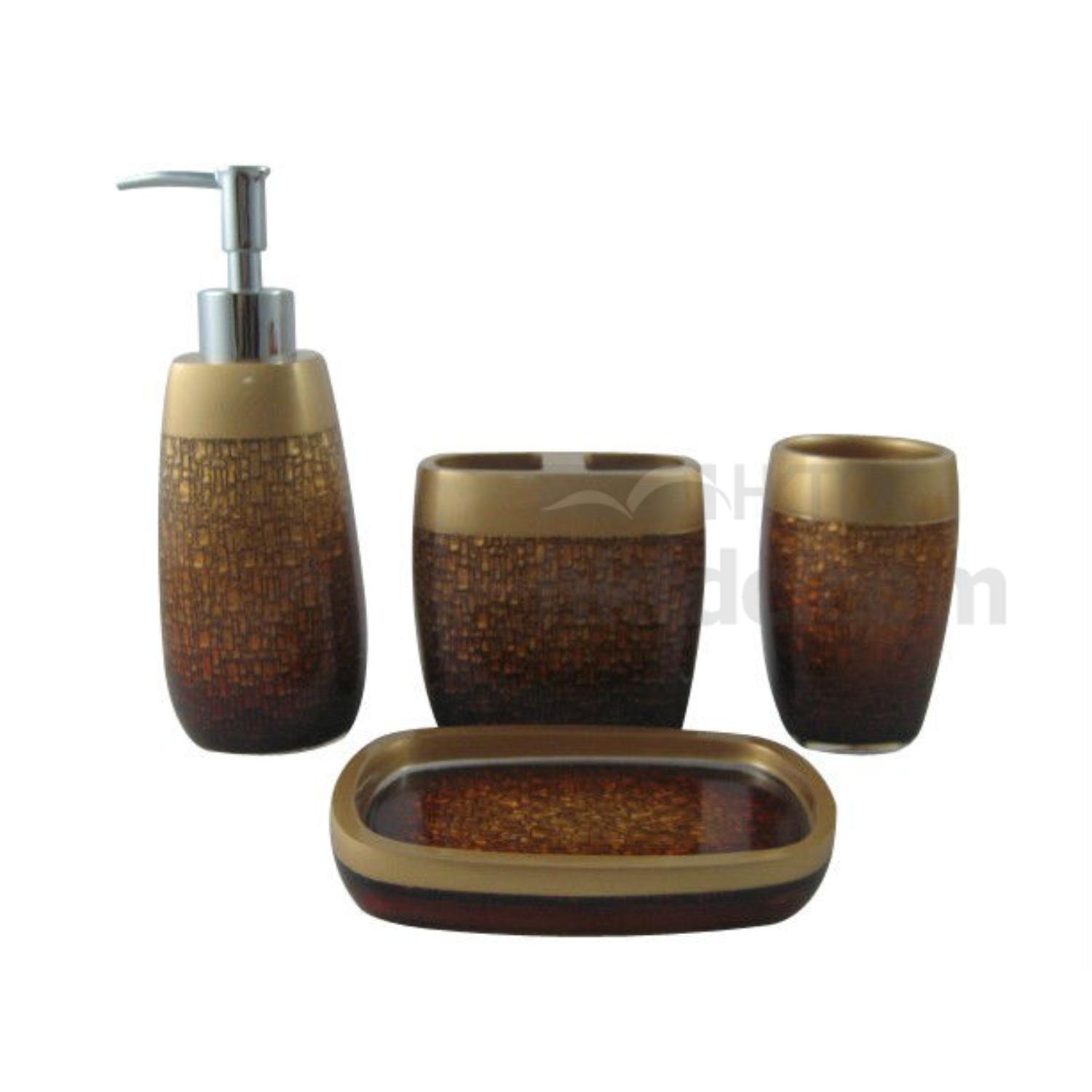 Poly bathroom accessories including lotion dispenser, thhthbrush holder, tumbler and soap dish. Rim and crack surface. Sparkling reflection give you a tastes of visual enjoyment.