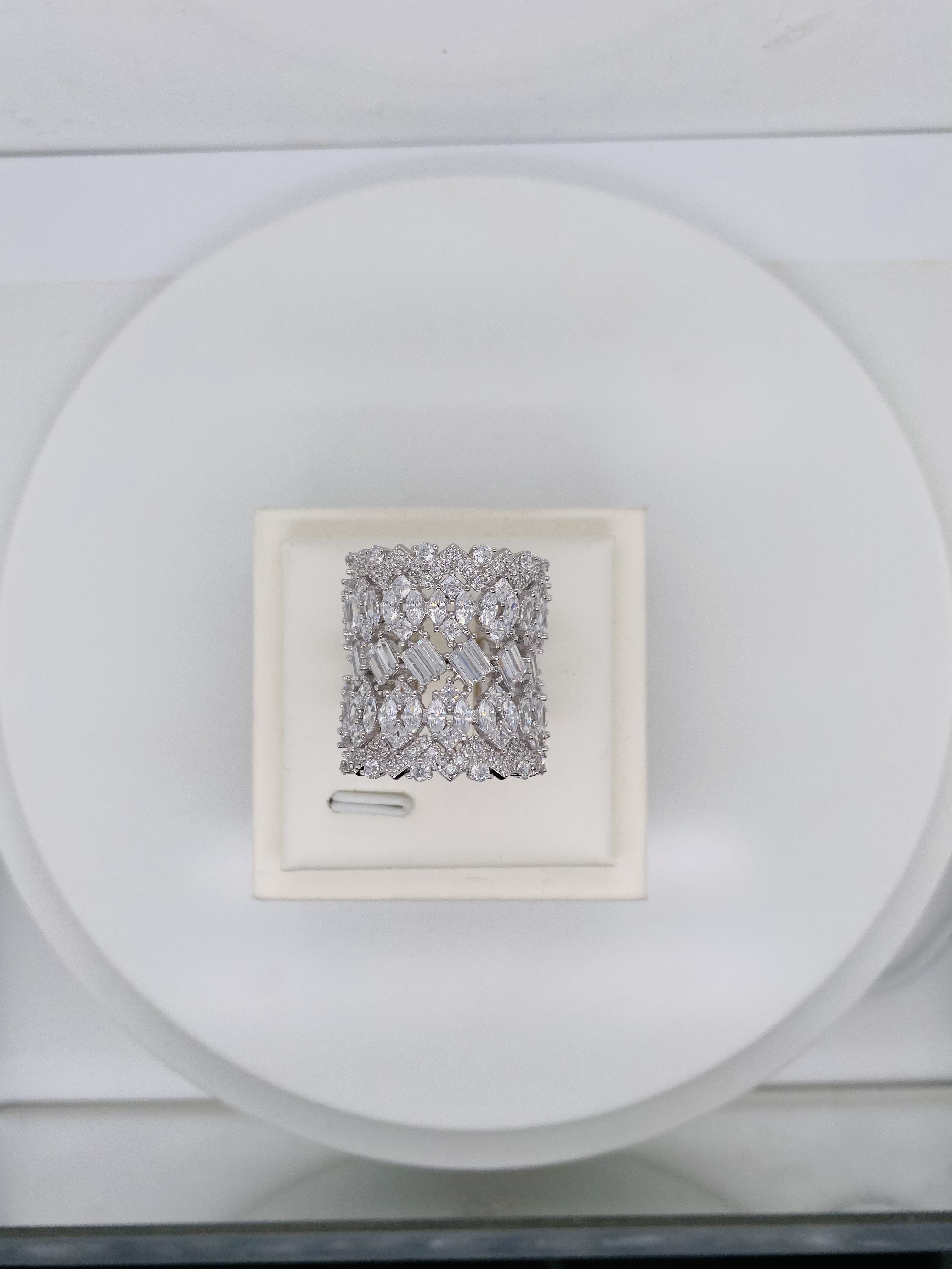 This diamond ring is a true showstopper. Its elaborate design features a combination of marquise - cut and baguette - cut diamonds, meticulously arranged in a geometric pattern. The interplay of different diamond shapes creates a dazzling display of light and sparkle. With its bold and luxurious look, this ring is perfect for making a statement on special occasions, adding a touch of high - end glamour to any ensemble.