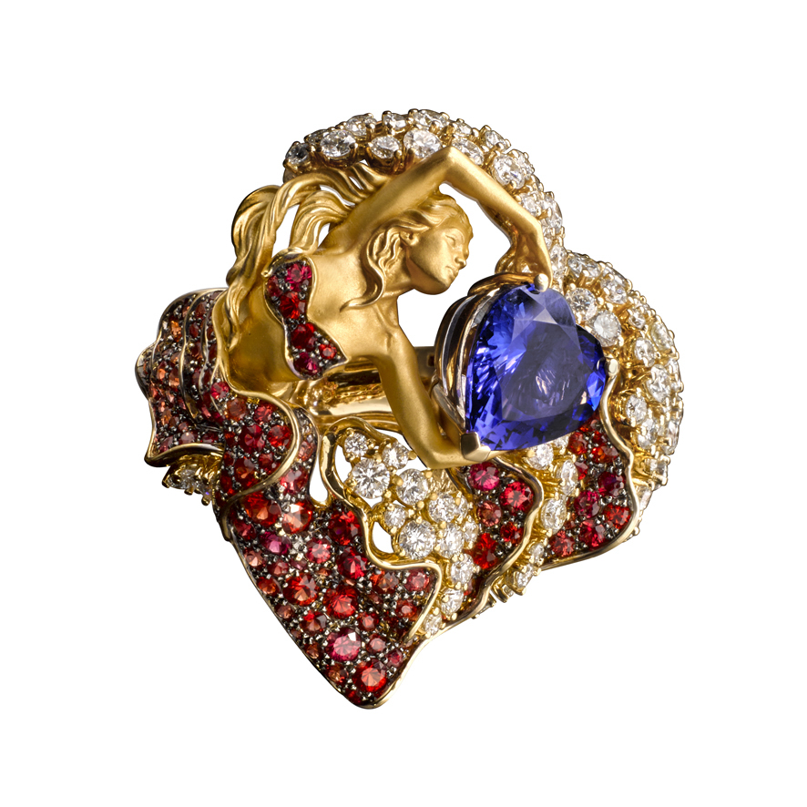 Made with 18kt yellow gold, diamonds, tanzanite and red sapphires.
