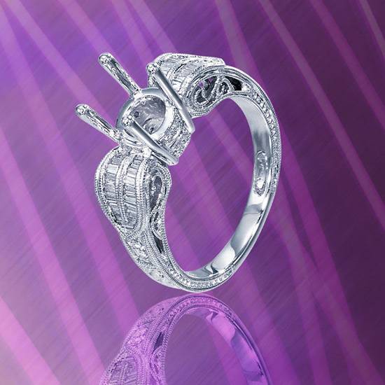 This is a ring setting with prongs. The shoulder of the ring is decorated with channel-set baguette diamonds. The shank is designed with Victorian filigree carving.