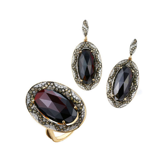 Let yourself be fascinated by this ring and earrings set. The large oval garnet stones glitter with unfathomable charm. Delicately accented by brilliant brown and white diamonds and rose gold frames, this jewelry set shows impeccable grace.