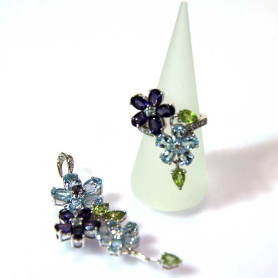 Ladies will love the romantic design of this ring and earrings set. Sparkling topaz and iolite are finely set to make lovely flowers that look especially good with the peridot leaves. The jewelry looks gorgeous with attention to details.