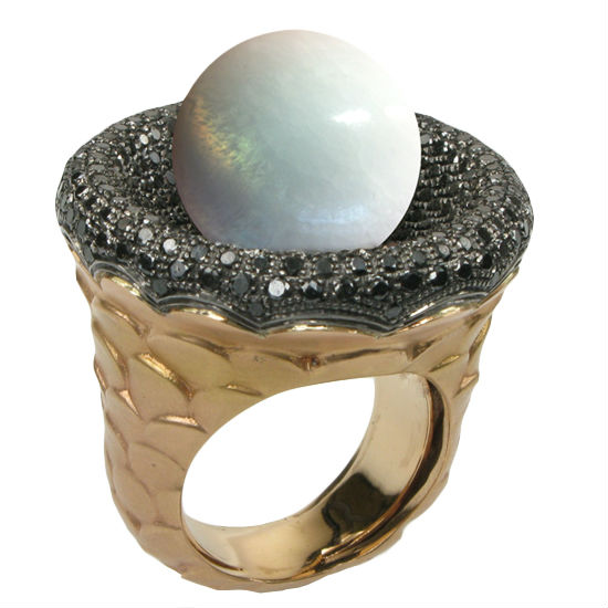 • Ring in 18kt rose gold, black diamonds cts 14.16 and natural clam pearl.
