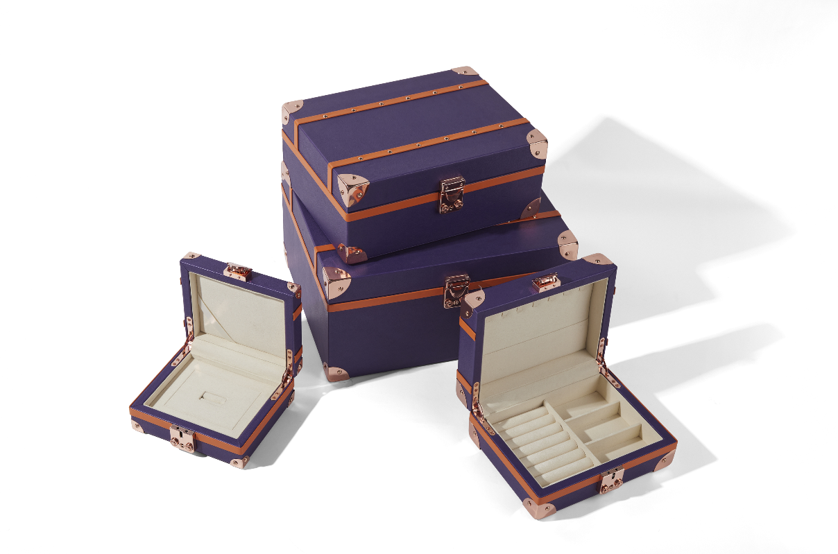 A rivet-designed jewellery box with a lock clasp, exceptionally distinctive and novel. The inner lining style and material colour can be customised, with the option to add LED lighting.